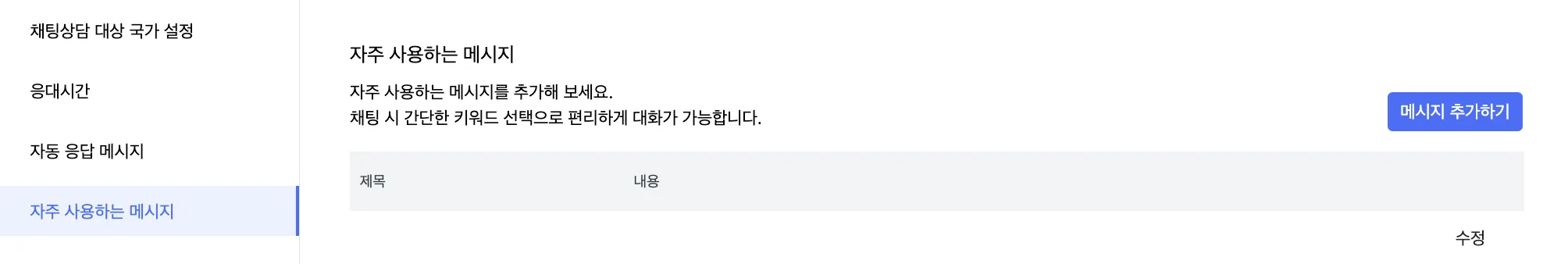 자주 사용하는 메시지 : 채팅 상담 진행시 자주 사용하는 메시지를 등록할 수 있습니다.