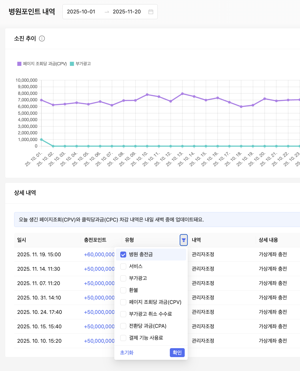 설정된 기간 내 병원포인트의 소진 추이가 그래프로 표시됩니다.