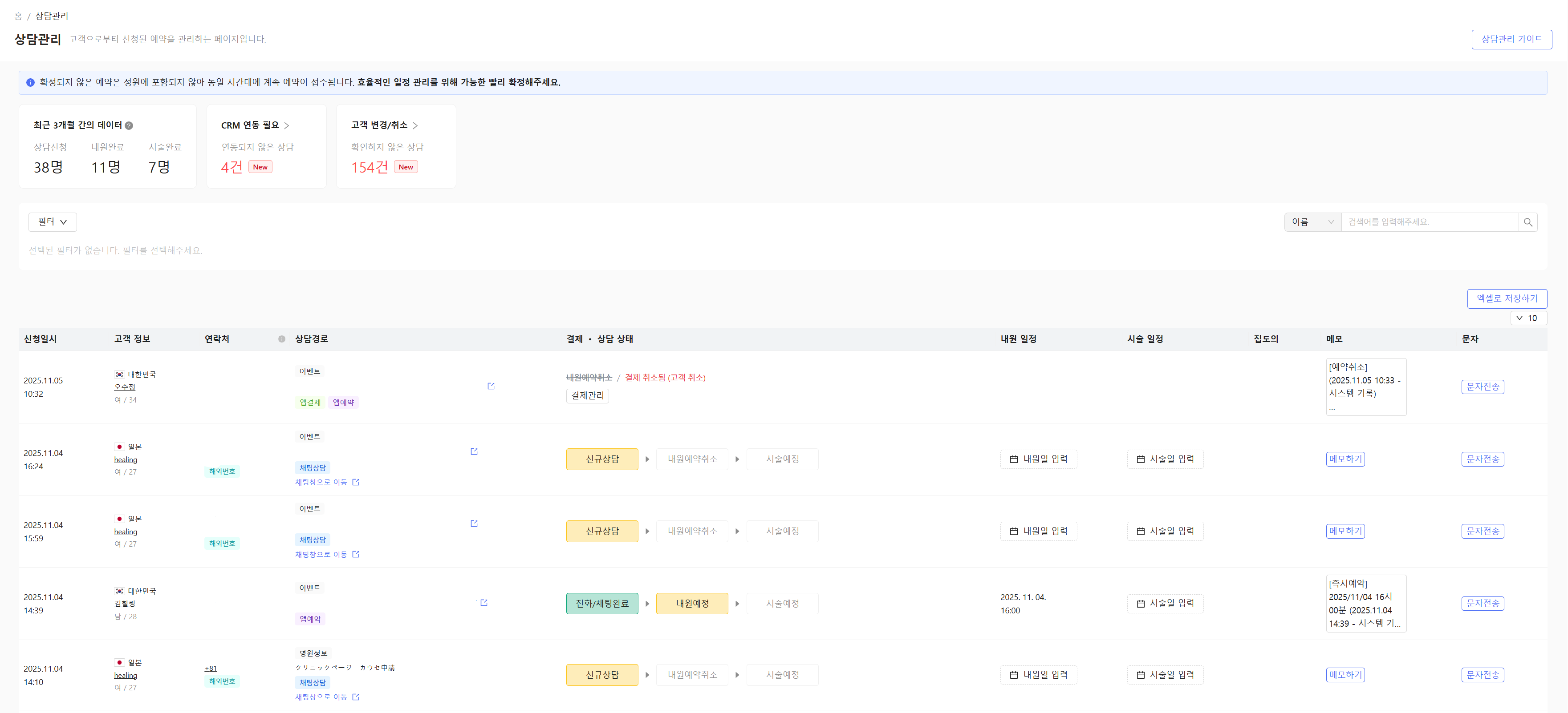 상담관리 탭 들어갔을 때 보이는 화면