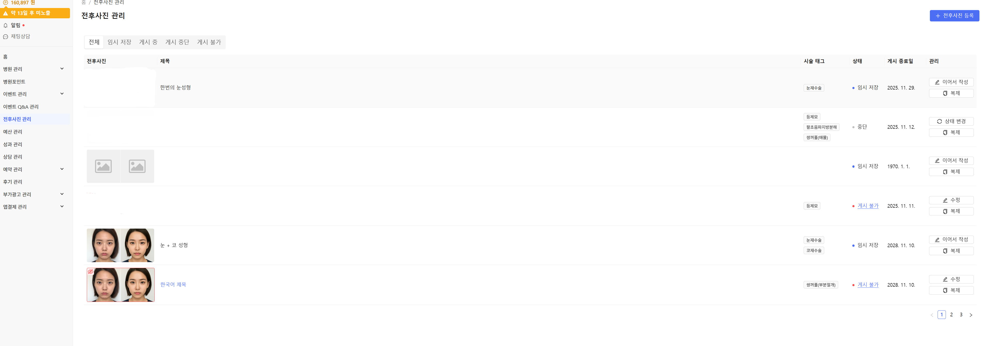 전후사진 관리 탭 들어갔을 때 보이는 화면