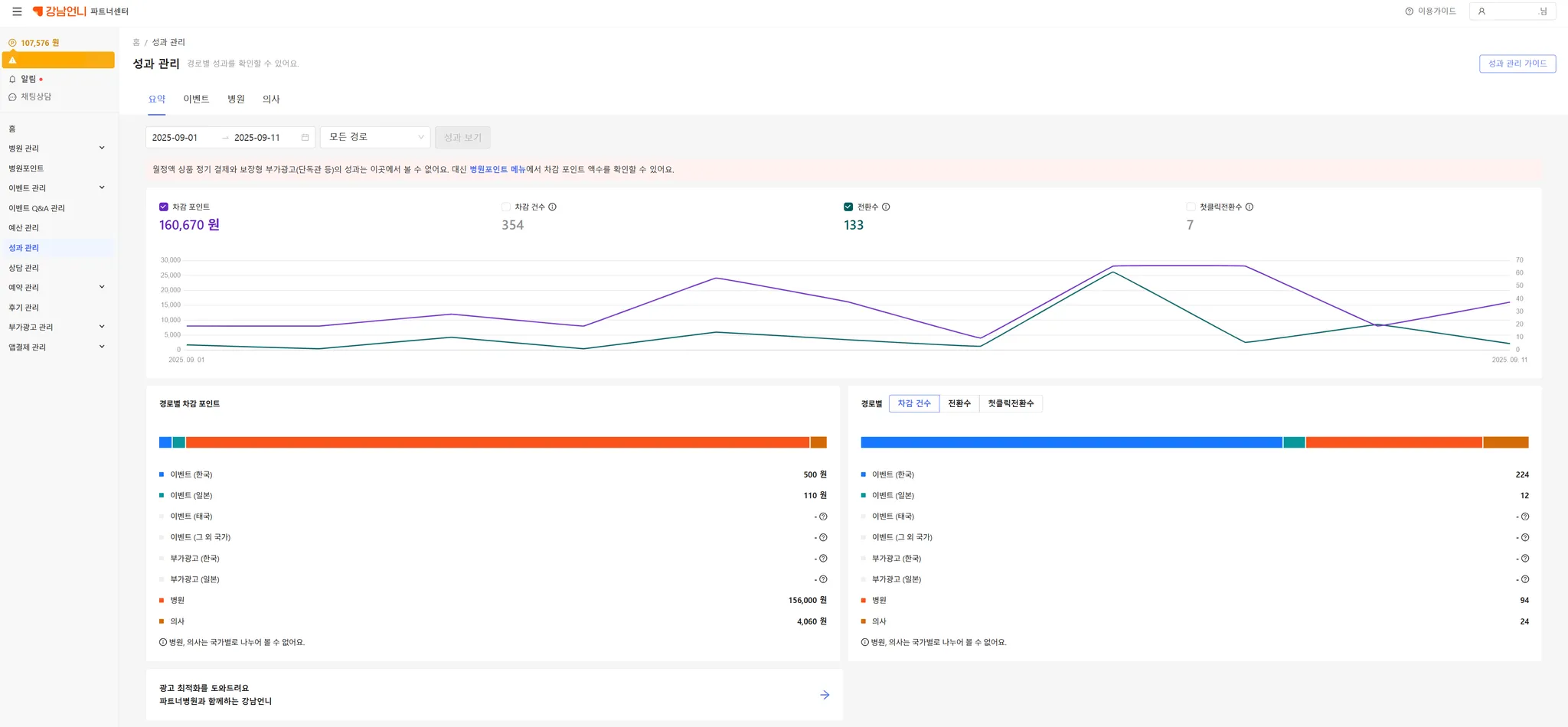 요약: 이벤트,병원,의사,성과형 부가광고의 기간 성과를 한눈에 조회할 수 있습니다.
