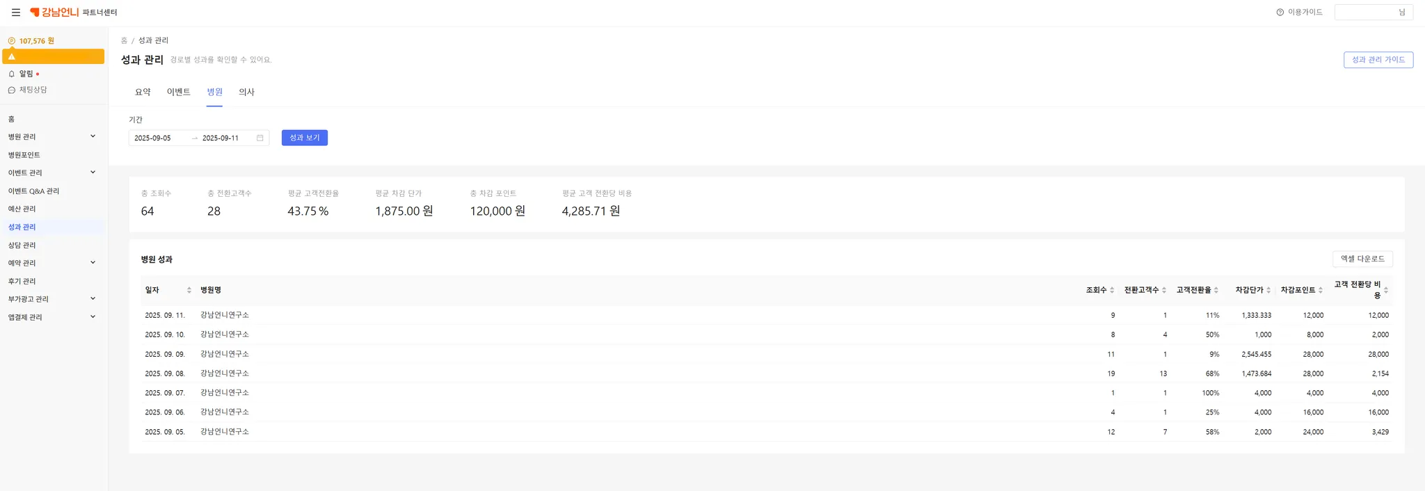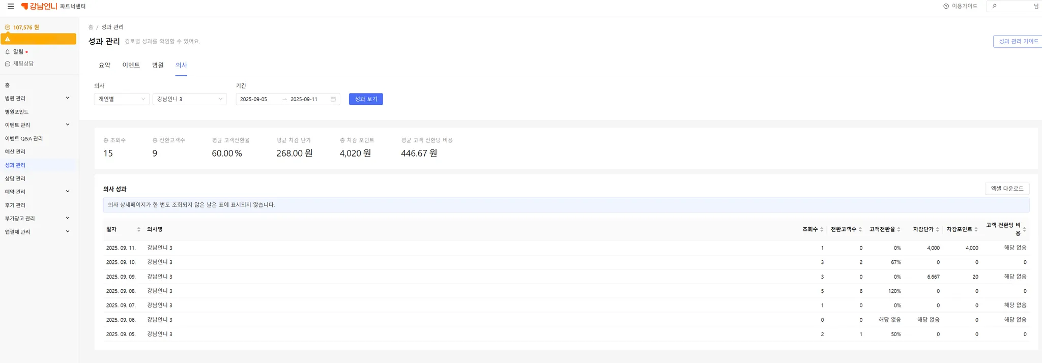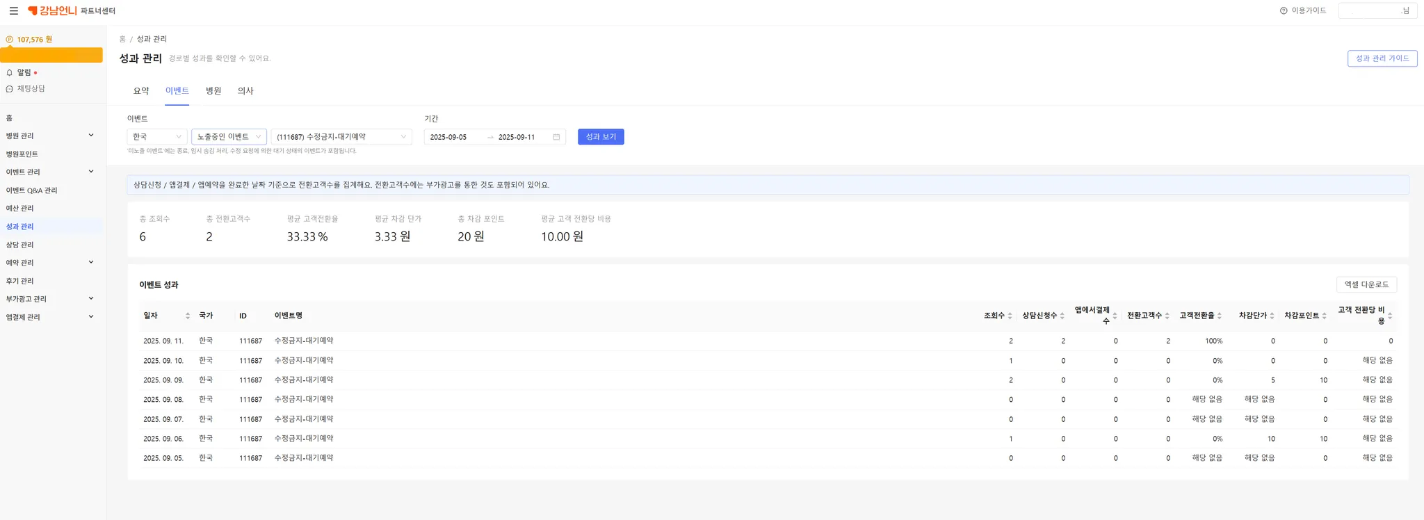 성과관리에서는 이벤트, 병원, 의사 페이지의 CPV 광고 성과를 확인할 수 있습니다.