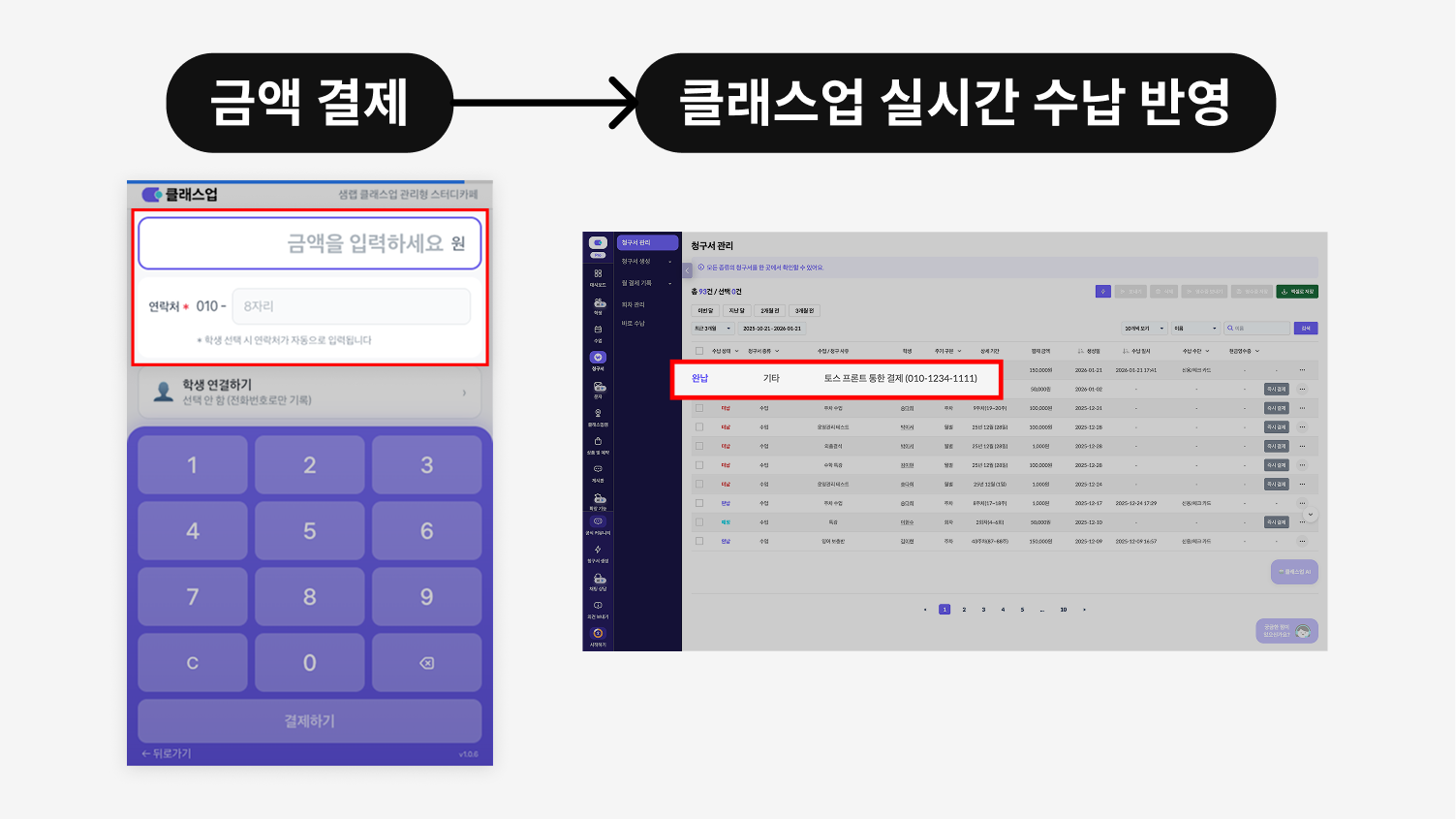 결제 시 학생을 선택/등록하여 누가 냈는지 즉시 기록합니다.