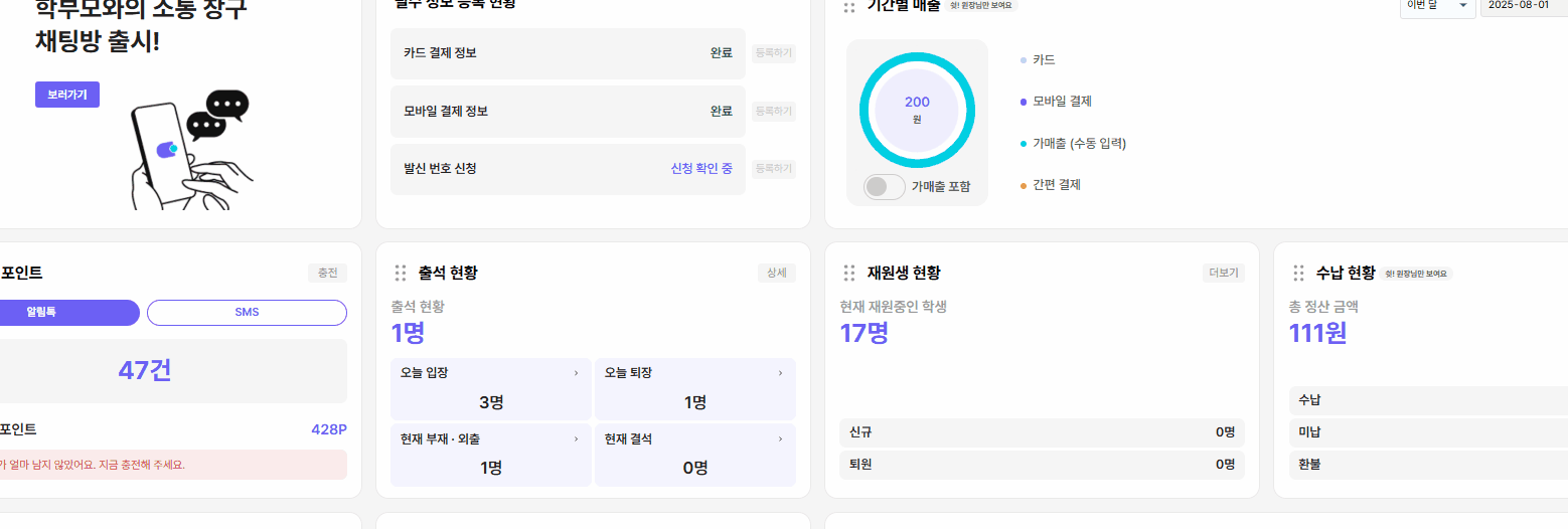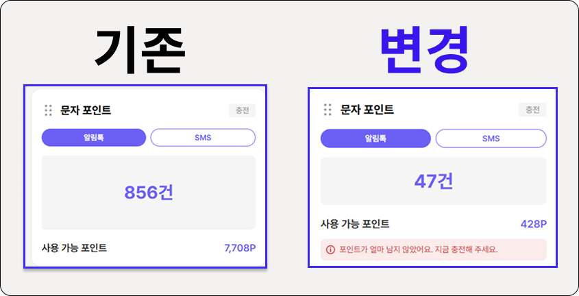 문자 포인트 부족 알림: 문자 포인트 잔액이 500포인트 미만일 때 대시보드에 알림이 표시됩니다.