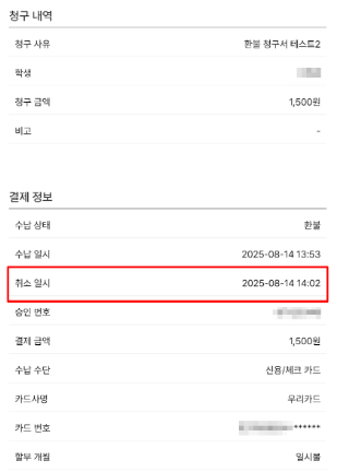 '취소 일시' 정보 추가: 청구서 결제 상세 및 영수증 저장 시 '취소 일시' 정보가 추가되었습니다. 환불 내역을 더욱 명확하고 투명하게 관리할 수 있습니다.