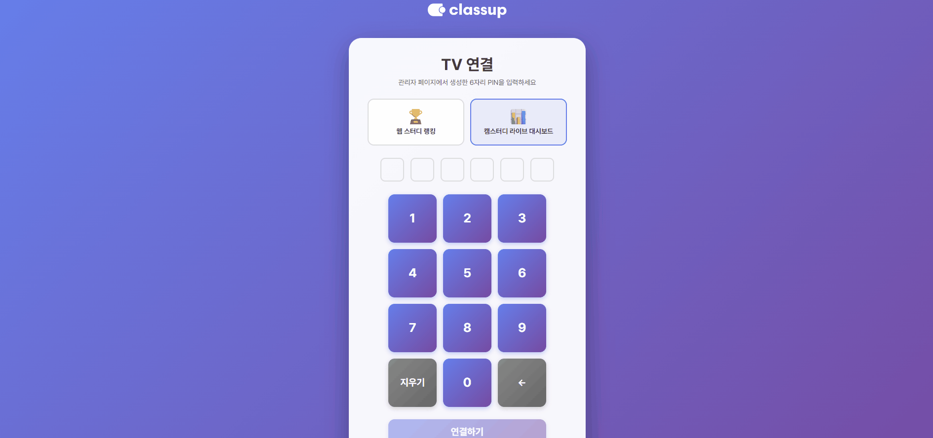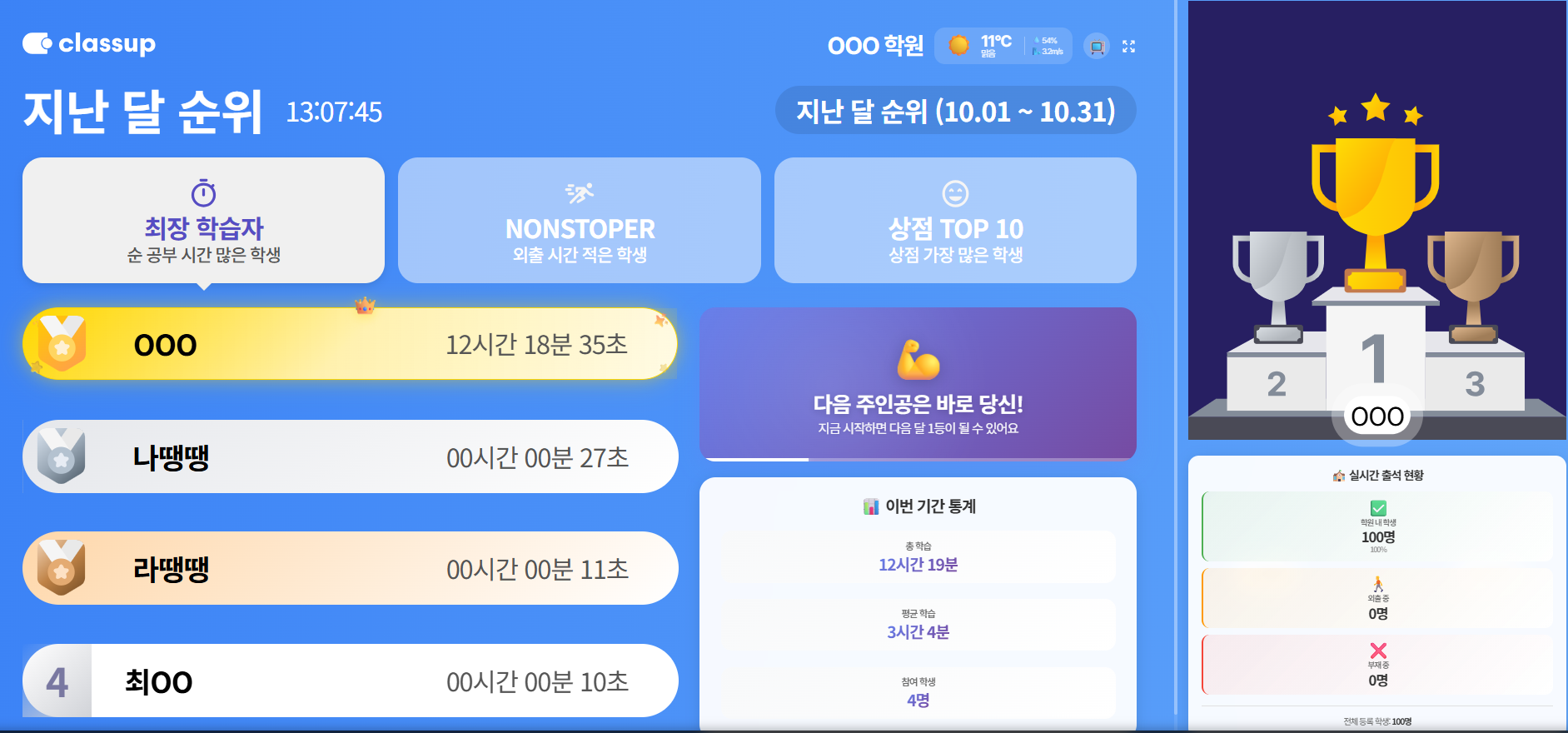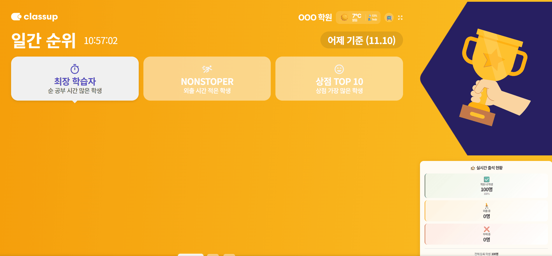 학원 내 TV 화면에 실시간 학습 랭킹이나 클래스업캠 출석 현황을 띄울 수 있는 기능이에요.