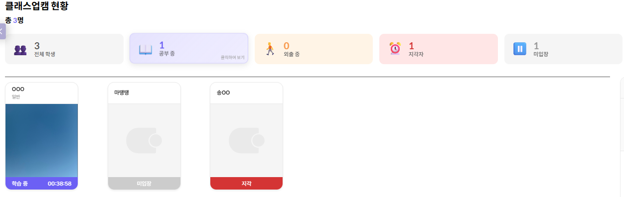 클래스업캠을 진행하는 학생들의 실시간 출결 현황을 한 화면에서 모두 확인할 수 있는 기능이에요.