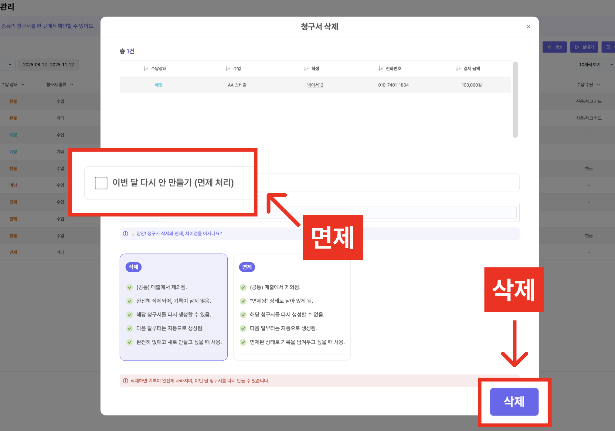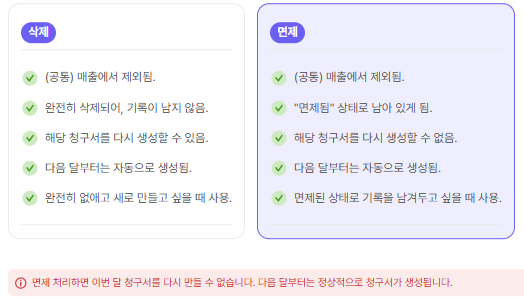 사용 경로: [청구서] → [청구서 관리] → [삭제 버튼] → [이번 달 다시 안 만들기 (면제 처리)]