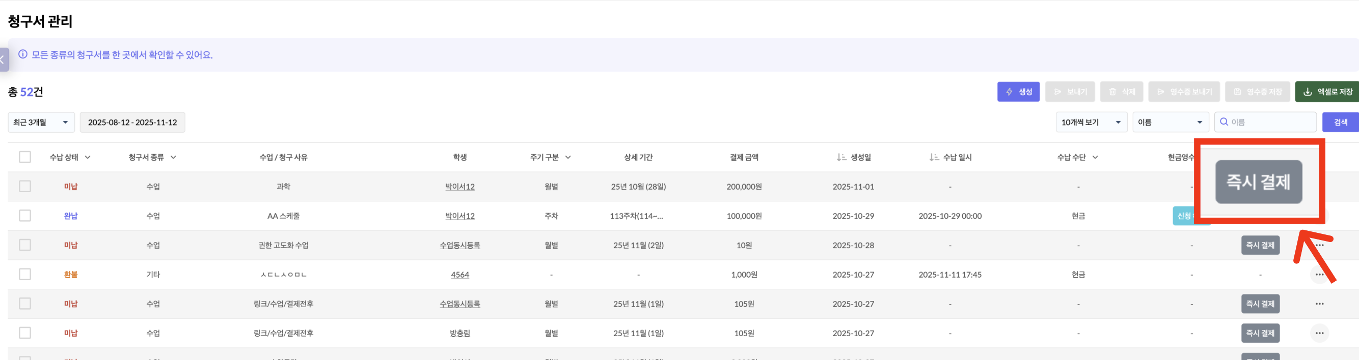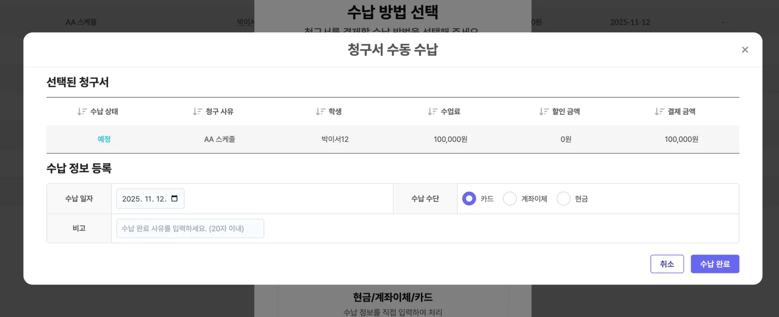 기존 '수동 수납' 기능을 [즉시 결제]라는 하나의 행동 흐름 안으로 통합해서, 현금/계좌이체/카드(수동) 결제를 한 곳에서 더 직관적으로 처리하실 수 있도록 개선한 것이랍니다.