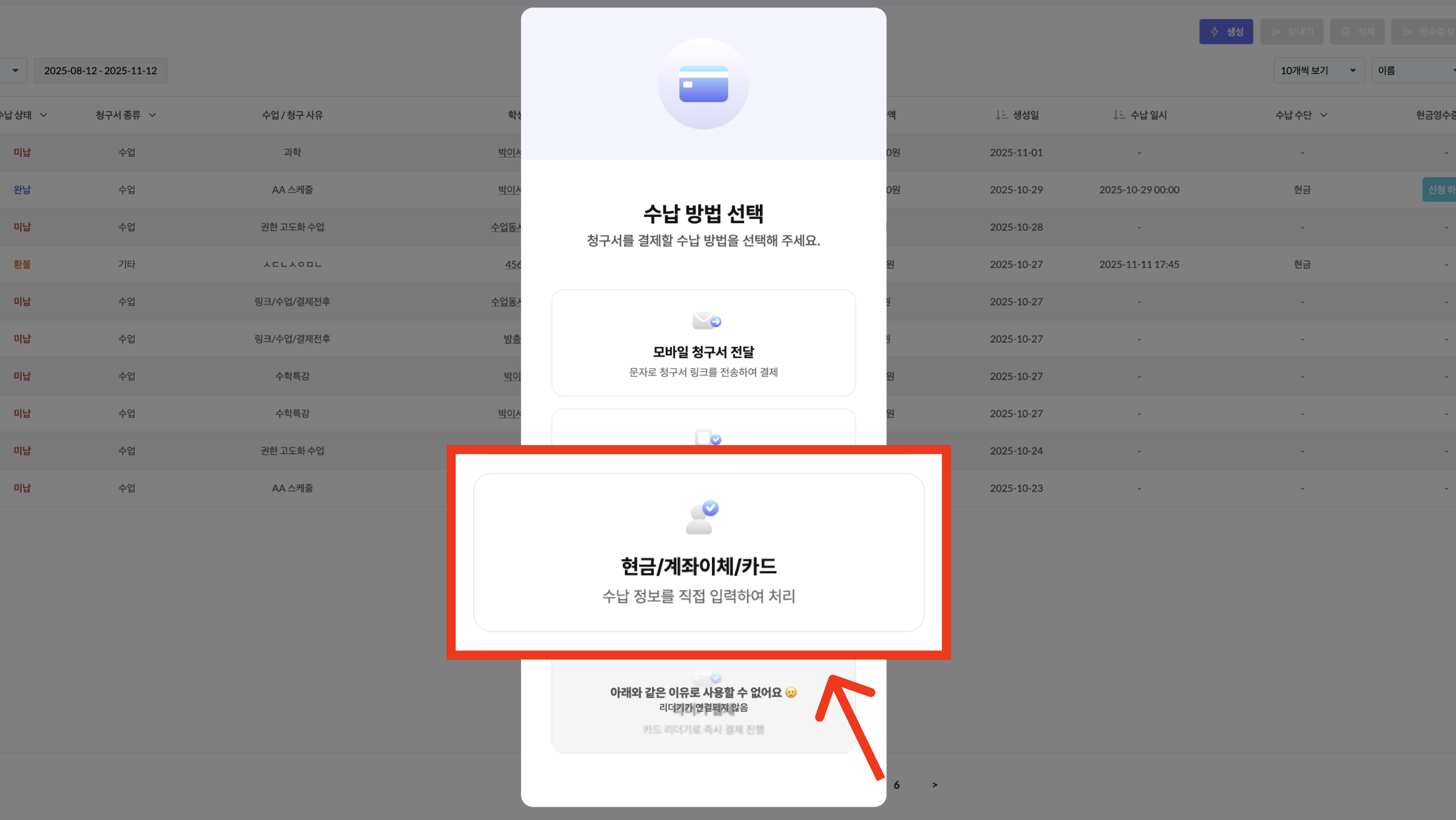 2) 팝업창에서 '현금/계좌이체/카드' 클릭
