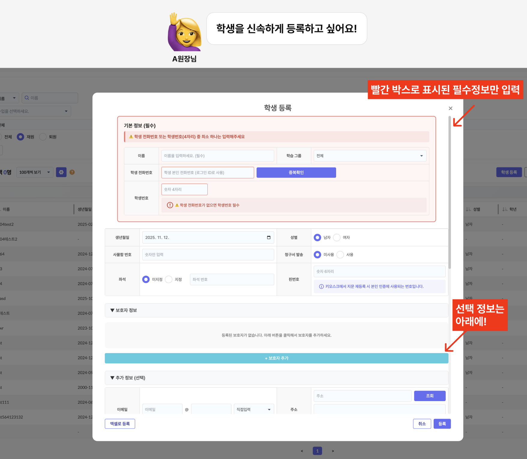 추천 대상: 신규 학생을 '빠르게' 먼저 등록하고 상세 정보는 나중에 수정하고 싶은 원장님 및 관리자