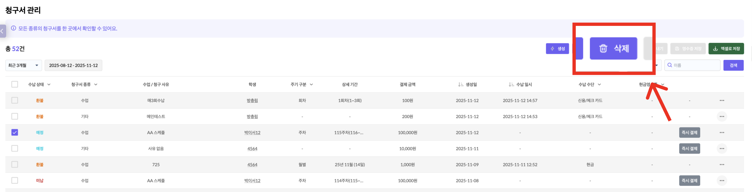 1) '청구서 관리' 화면에서 '삭제' 버튼 클릭해주세요~!