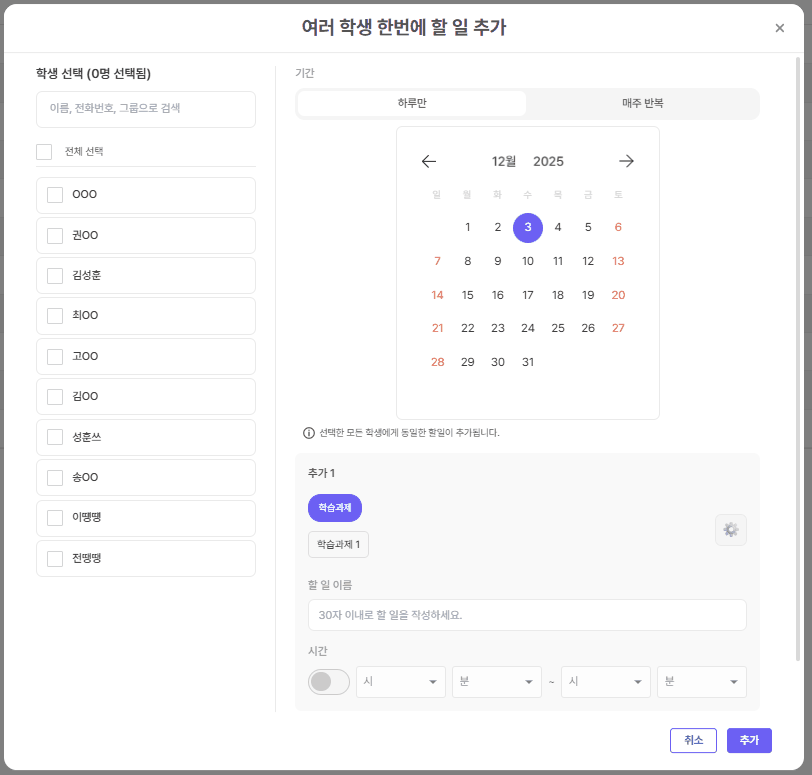 유연한 기간 설정: 하루짜리 과제는 물론, 매주 반복되는 숙제도 문제없어요! 기간과 요일을 선택해 원하는 날짜에만 쏙쏙 등록할 수 있습니다.