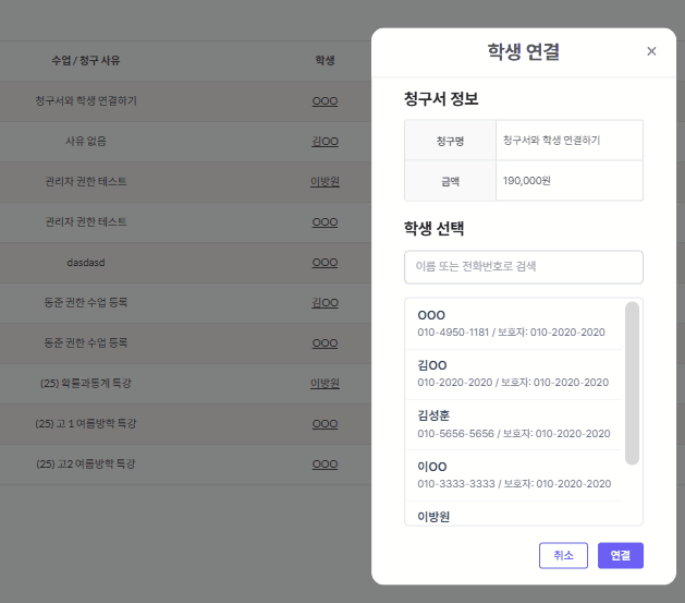 결제 내역에 학생이 연결되어 있지 않더라도 당황하지 마세요. 이제 직접 학생을 연결하거나 정보를 변경할 수 있어 수납 관리가 훨씬 정확해집니다.