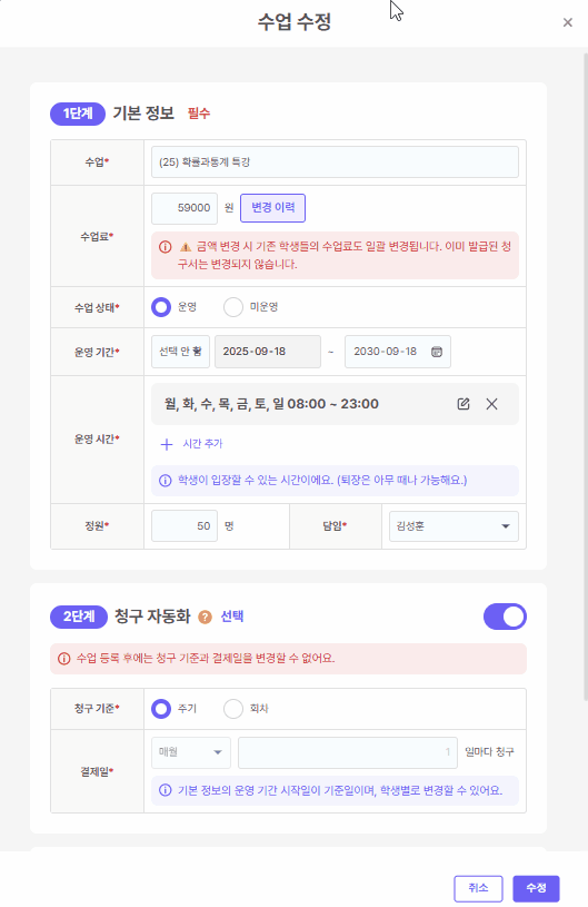수업료를 변경하면 기존에 등록된 모든 학생의 수업료도 함께 업데이트 되도록 개선되었어요. 일일이 수정해야 했던 번거로움을 덜어드려요.