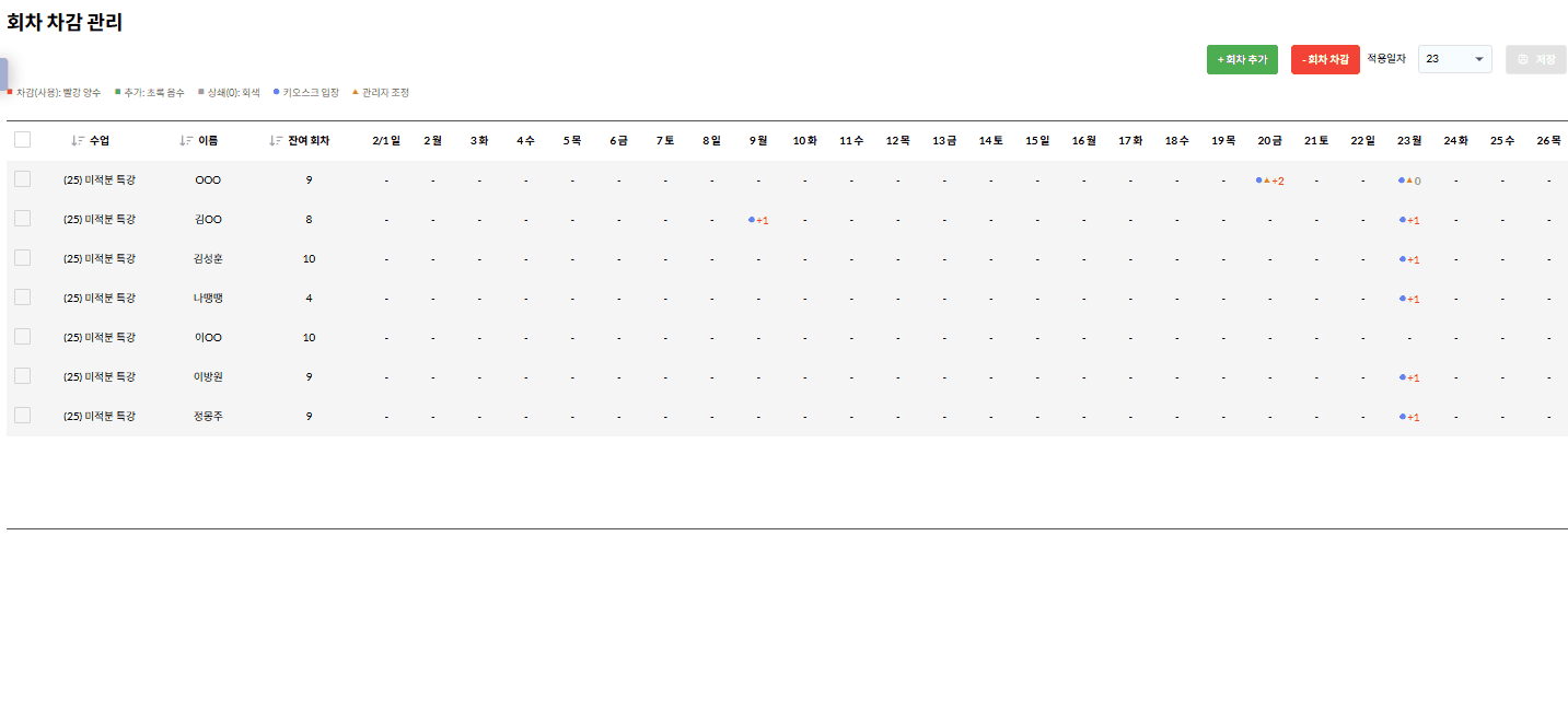수업 달력에서 회차 조정 이력을 한눈에 확인하고, 자동 입장인지 수동 추가인지 구분할 수 있게 되었어요. 잘못 기록된 회차는 상세 화면에서 바로 삭제도 가능해요.