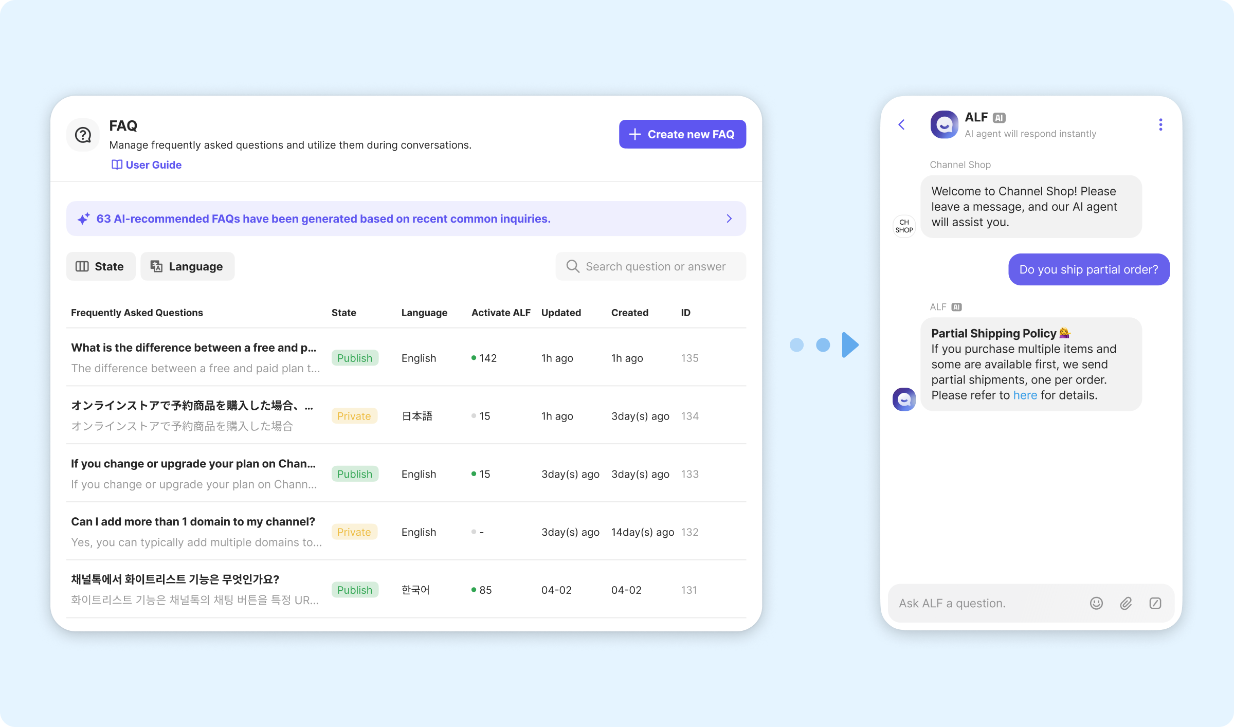 With Channel Talk AI, you can resolve issues without connecting to an agent in the following scenarios! Let our AI agent, ALF, handle routine inquiries so your team can focus on what truly matters.