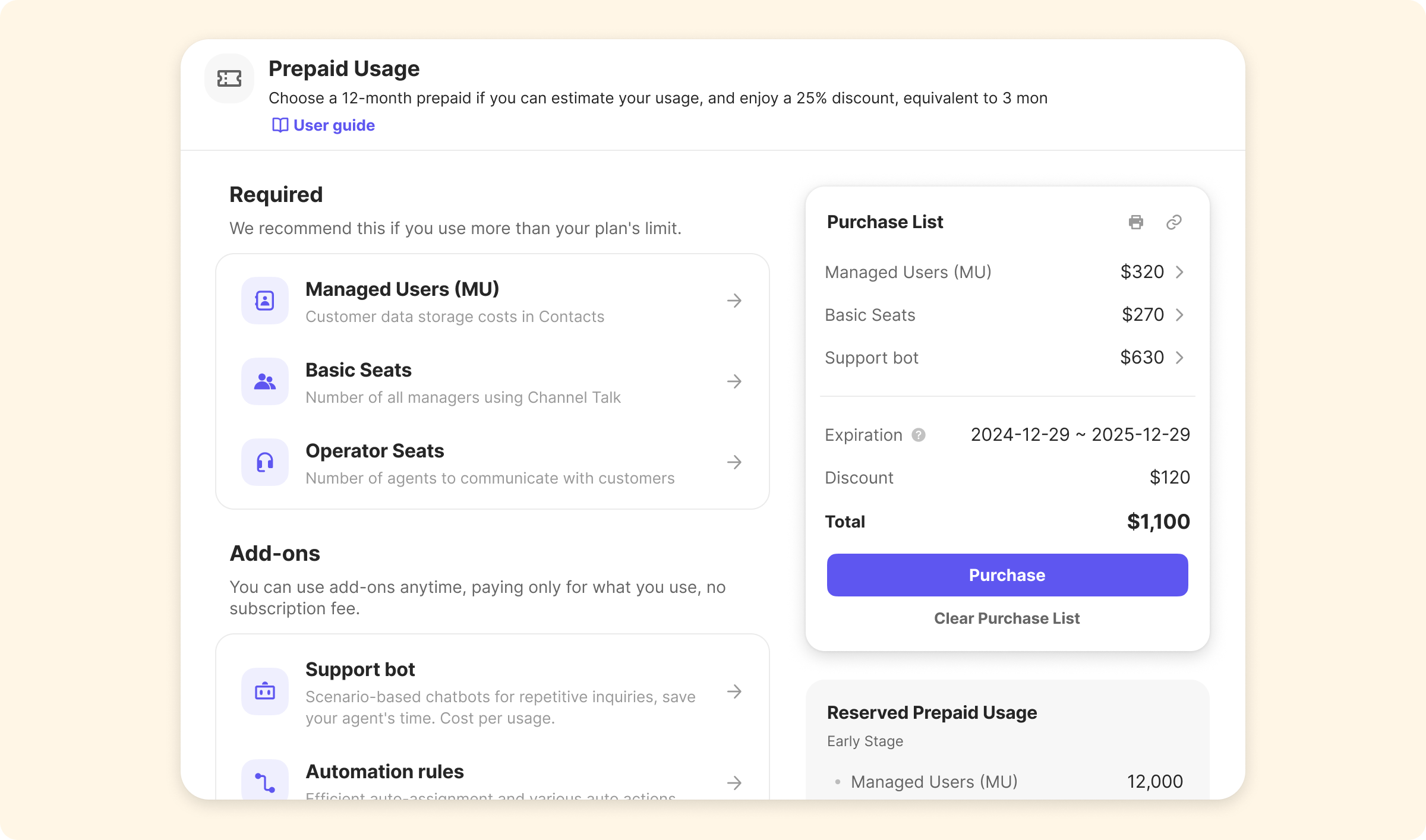 Prepaid is the most affordable way to subscribe to Channel Talk! If paying for different usages individually has been inconvenient, you can now pay for them all at once, whenever you want.