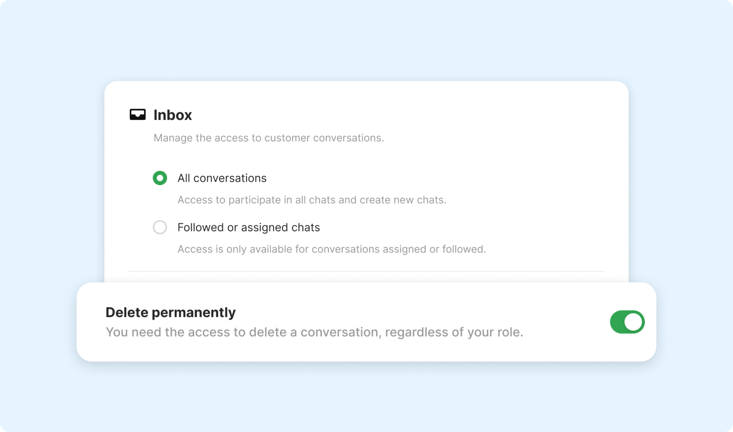 After the update, the permission to permanently delete chat history is separate from Inbox view access. Without this permission, agents cannot delete a chat, even if they are the assignee or a follower.