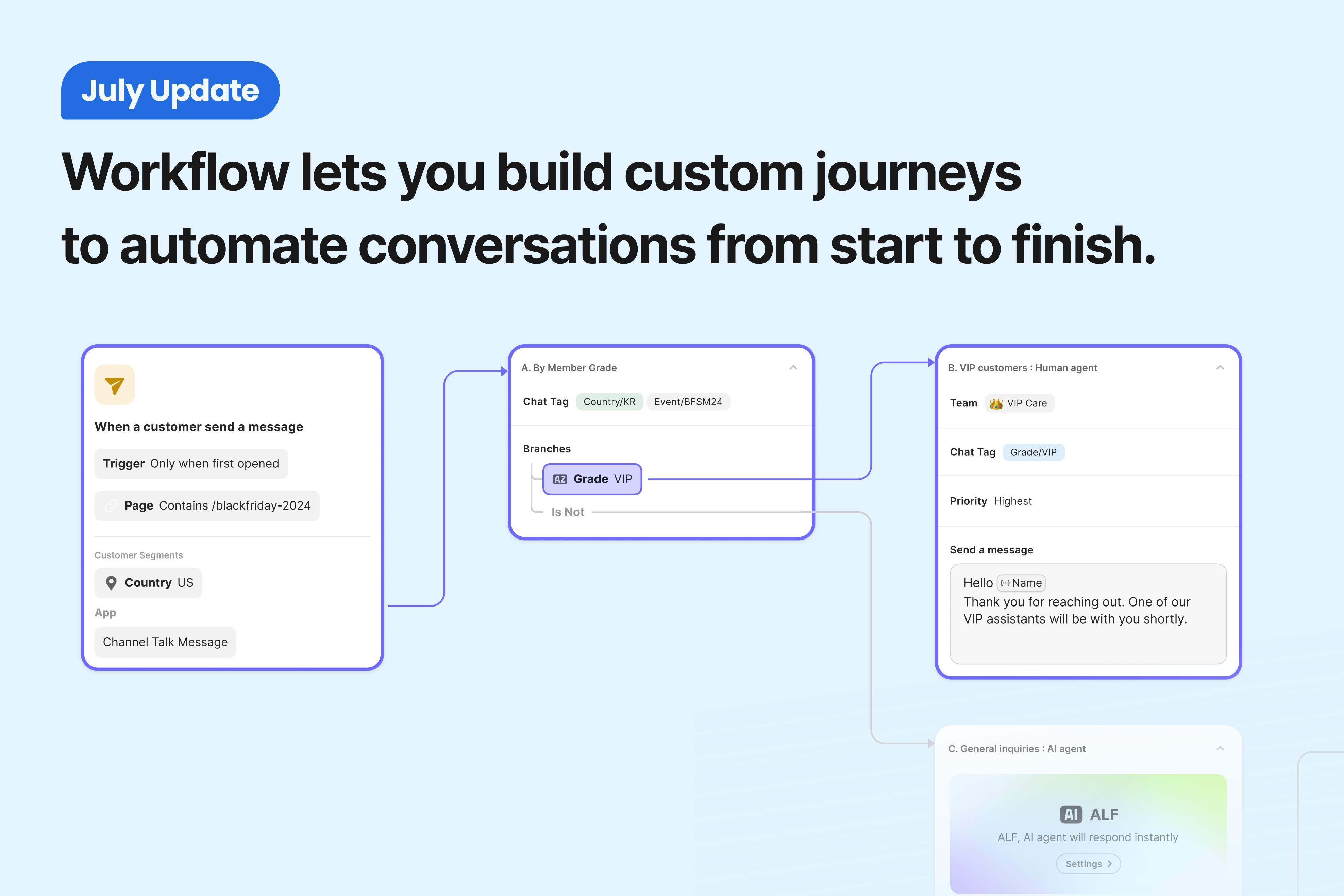Workflow is a user journey builder of customizable scenarios for each segment and situation, automating your chats from start to finish. Get ready for more comprehensive chat automation capabilities combined with AI.