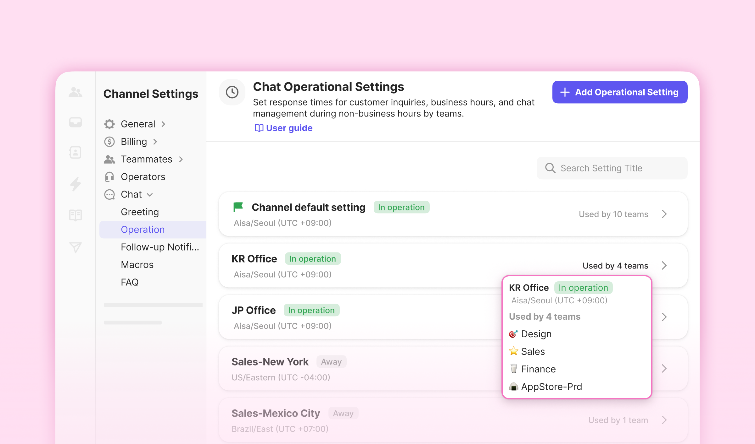 Operational settings including business hours that were previously set per channel will now be set per team.