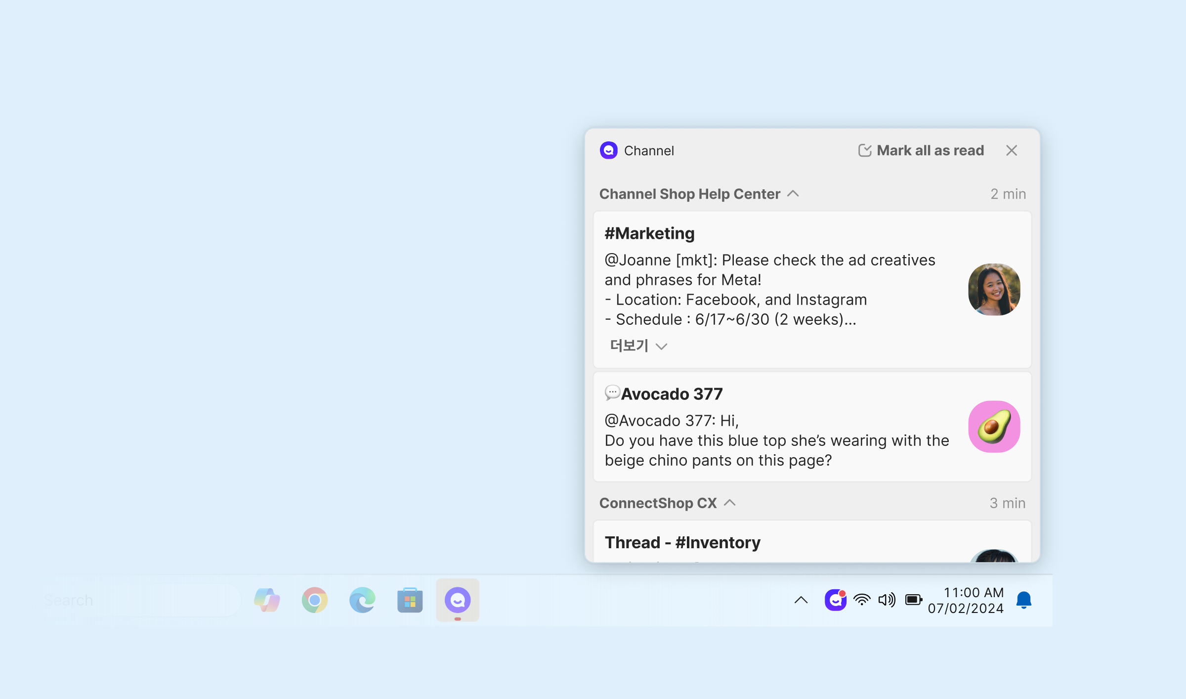Channel Talk is coming to the Notification Center on Windows devices. We've added a feature to organize your Channel Talk notifications at a glance, helping you stay on top of what's important to you.