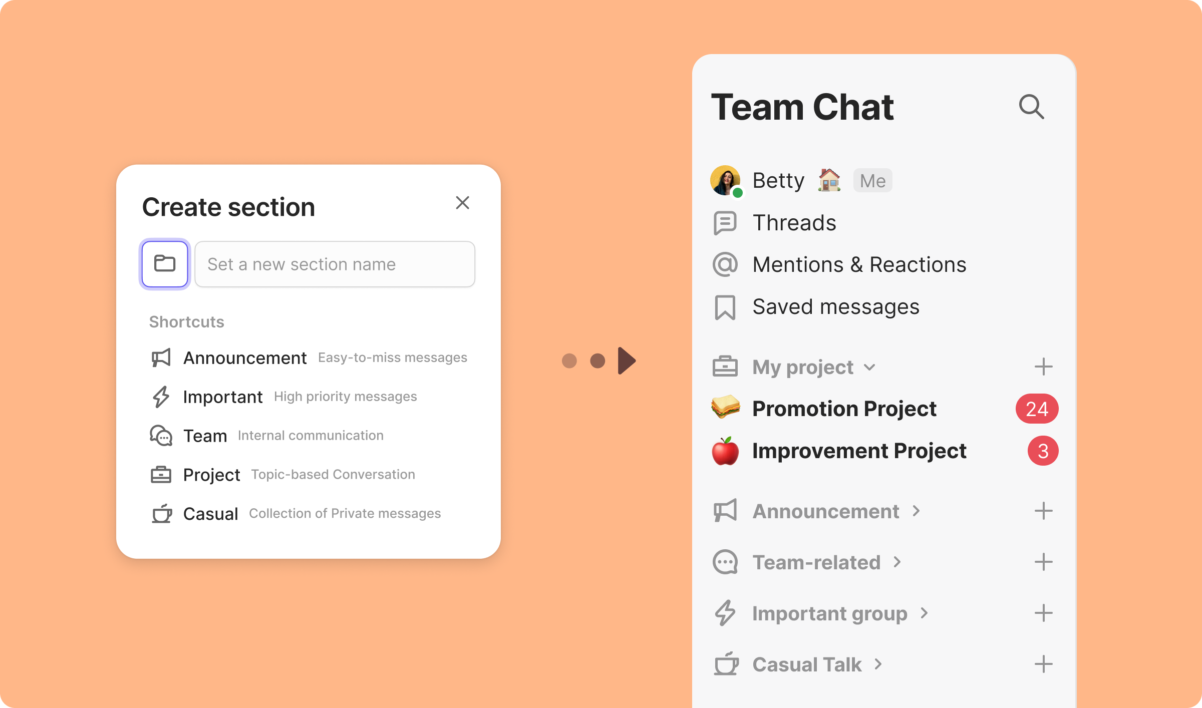Create appropriate categories such as team, task, or project sections to organize your chat rooms. Easily change the position of each section by dragging and dropping according to priority.