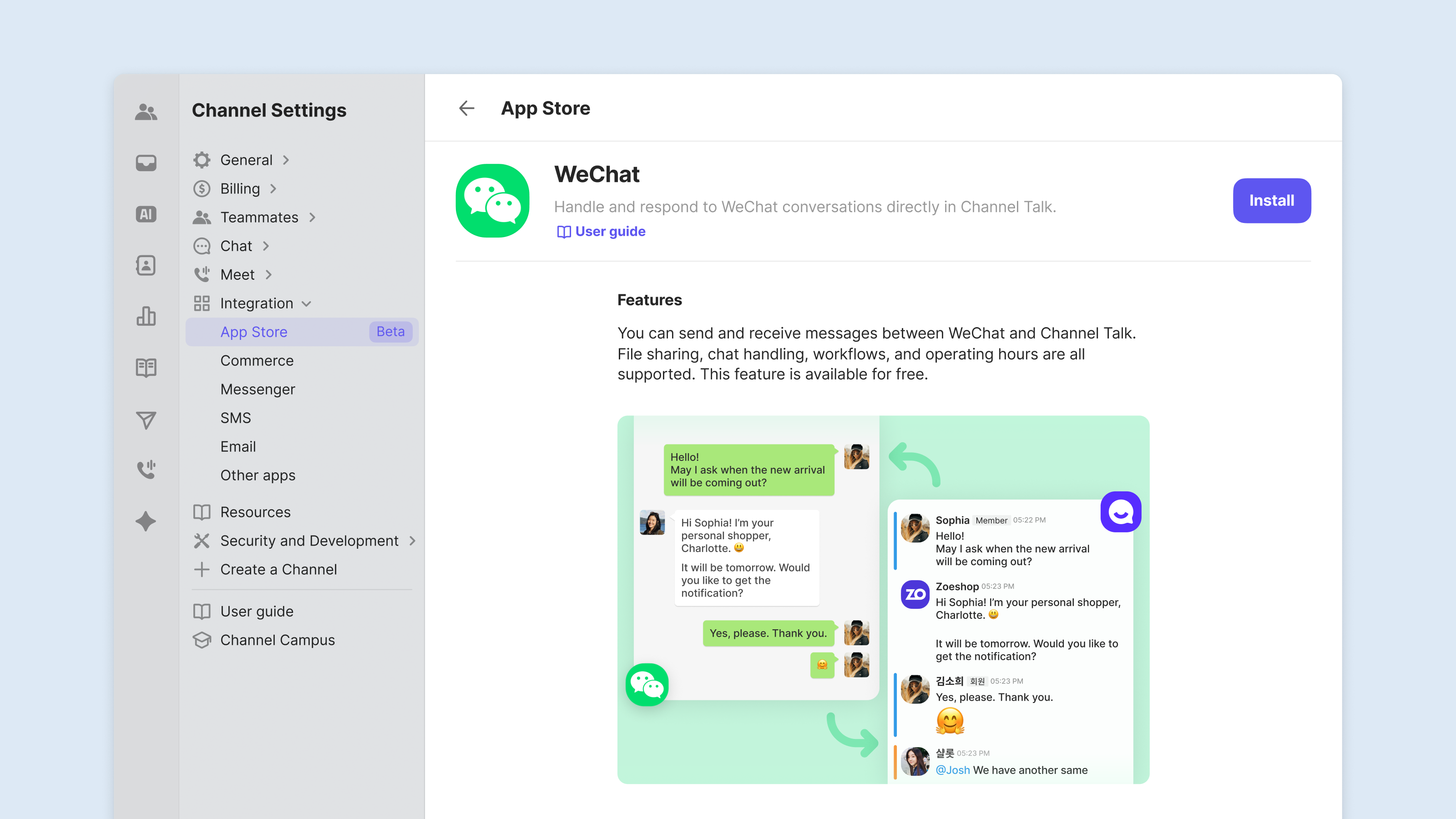 WeChat integration is now available. Once connected, you can view and respond to WeChat messages directly from Channel Talk.