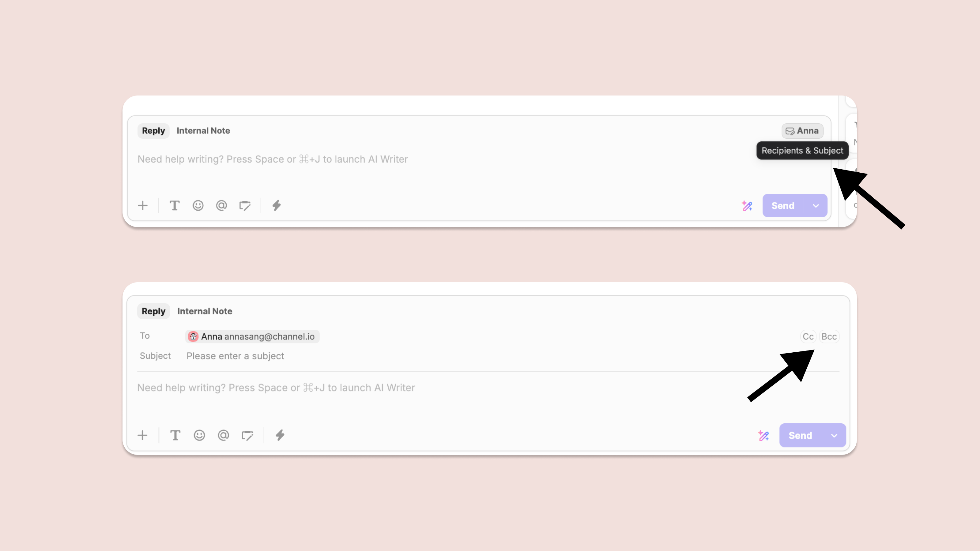 When replying to a customer email in Channel Talk, there's a new button on the right hand corner with the recipient information.