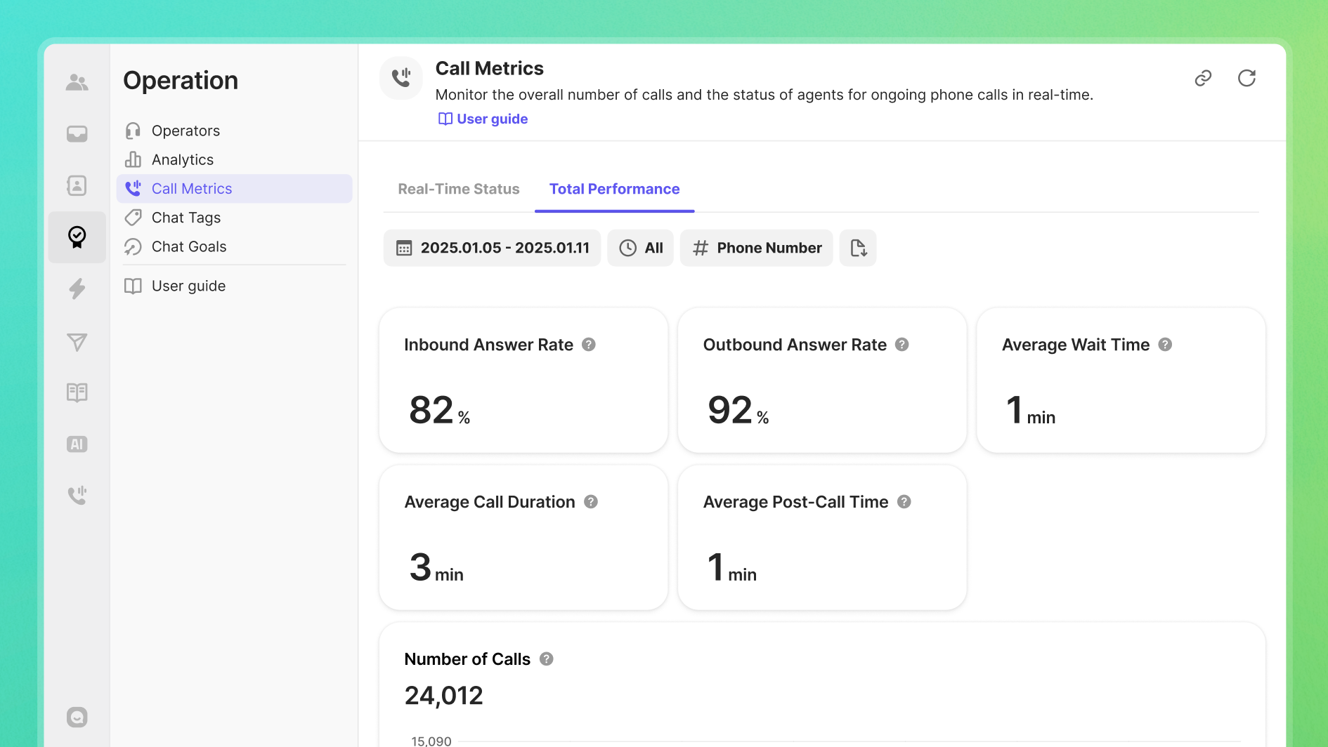 Now, you can directly view important call statistics like answer rates and average wait times without any process by going to: [Operation] - [Call Metrics] - [Total Performance].