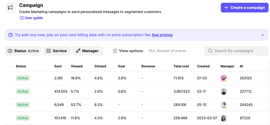 “Sent,” “Views,” and “Clicks” values in the marketing list