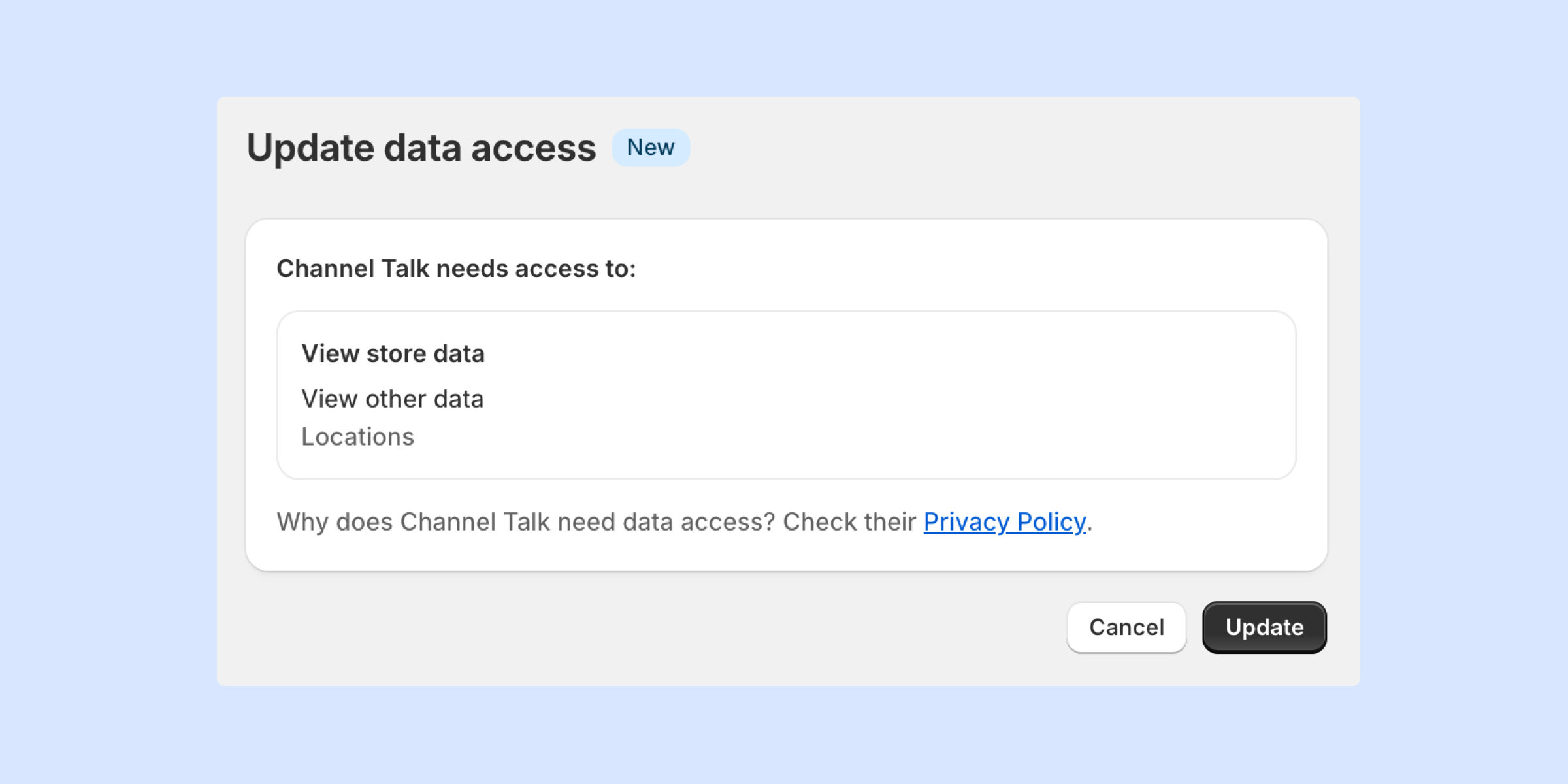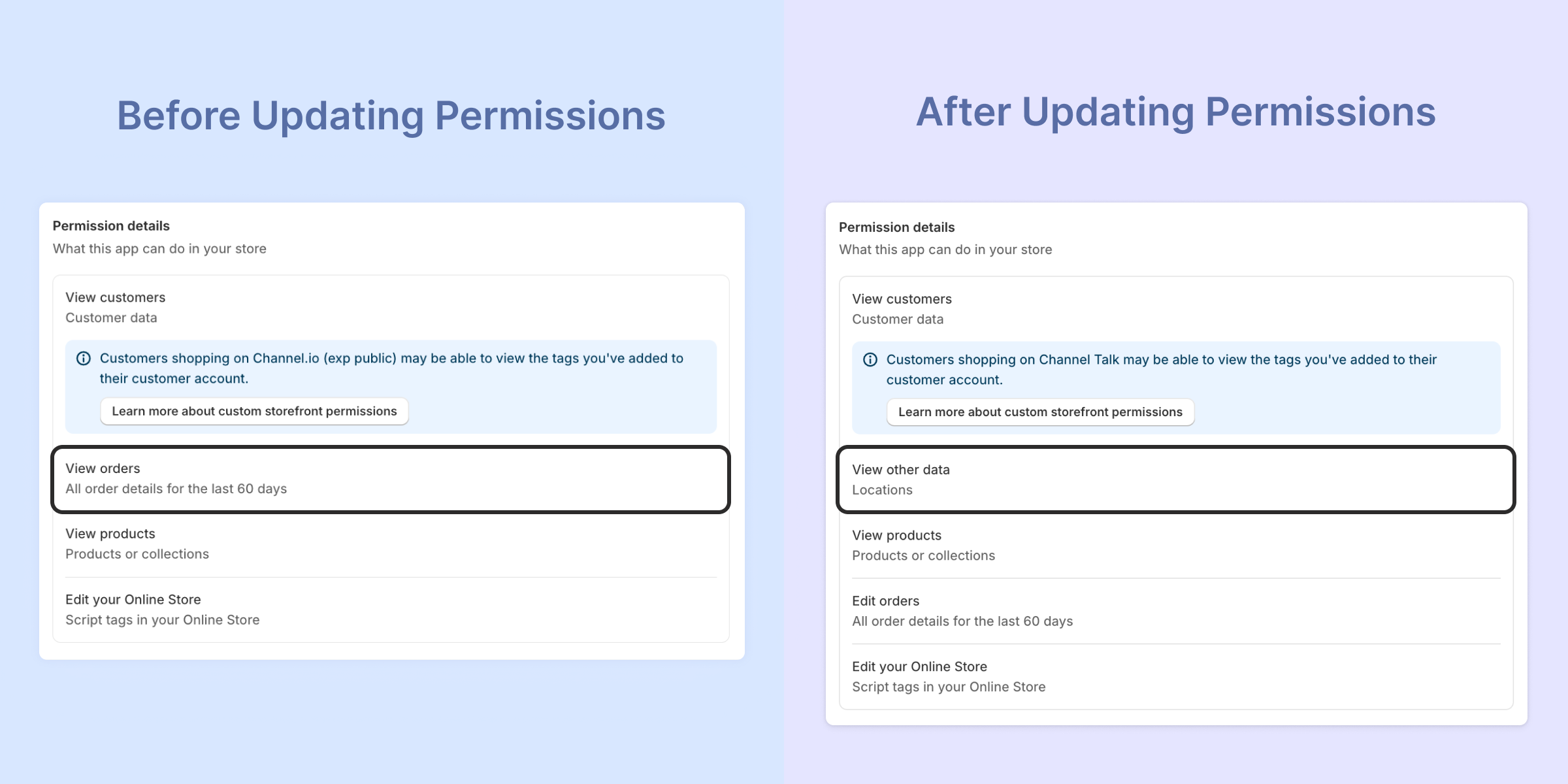 Change: To allow customers to cancel orders via command, you need to update Channel.io app permissions on the Shopify admin page.