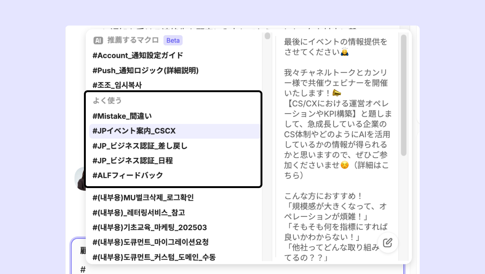 既存の「よく使う」はシステムが任意にマクロを選定していたために不便な面がありました。今回の改編で、実際によく使うマクロを直接固定しておき、より早く活用できるようになります。
