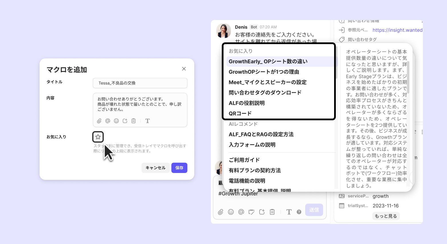 [チャネル設定] - [問い合わせ] - [マクロ] で右上の「お気に入り」をクリックして表示の順番を変更することも可能です。