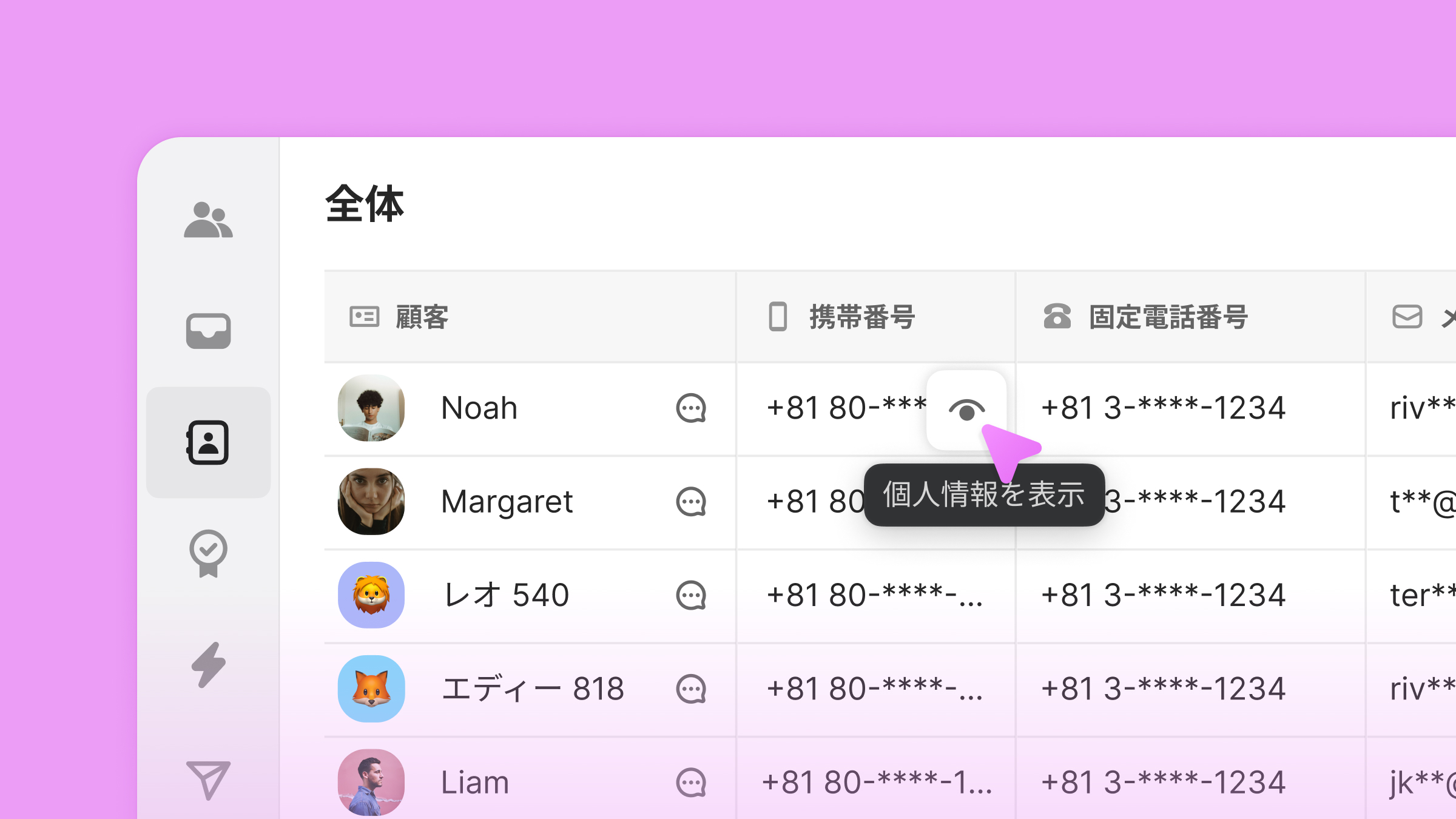 顧客情報のうち、個人情報として取り扱う項目をマスキング処理することで、顧客情報をより安全に管理することができます。今後は、個人情報を閲覧したスタッフのログを確認する機能も追加される予定です。