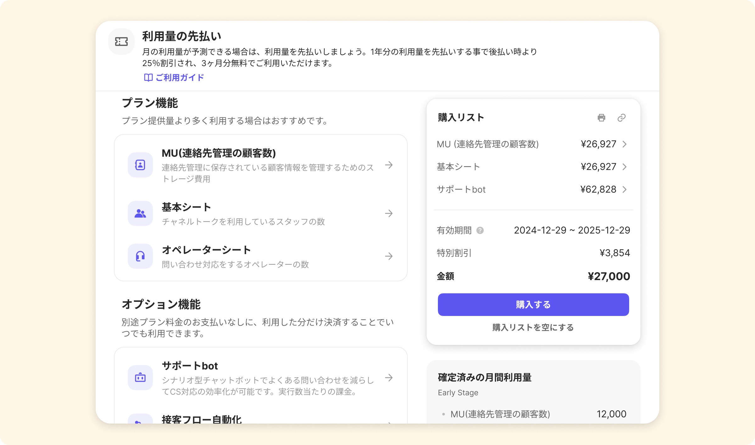 チャネルトークをお得にご利用いただける「利用量の先払い」ですが、これまではそれぞれの機能を決済時点に合わせて購入する必要がありました。今回のアップデートで、希望する時に一括で購入することができるようになりました