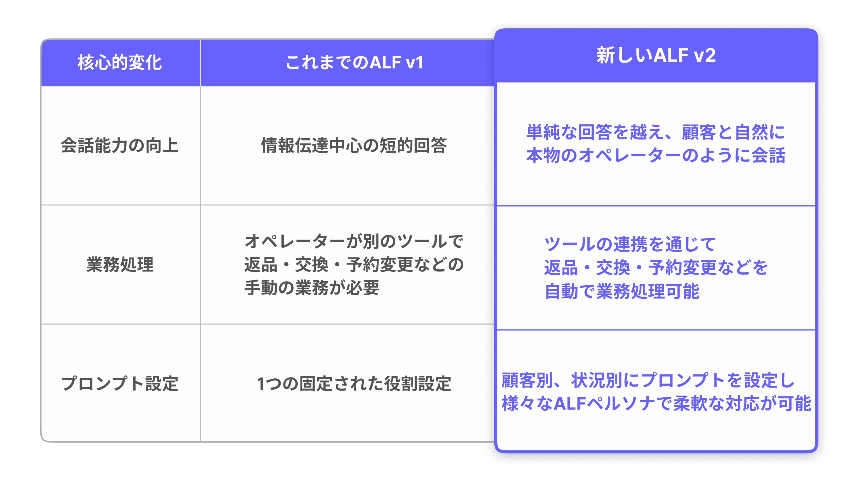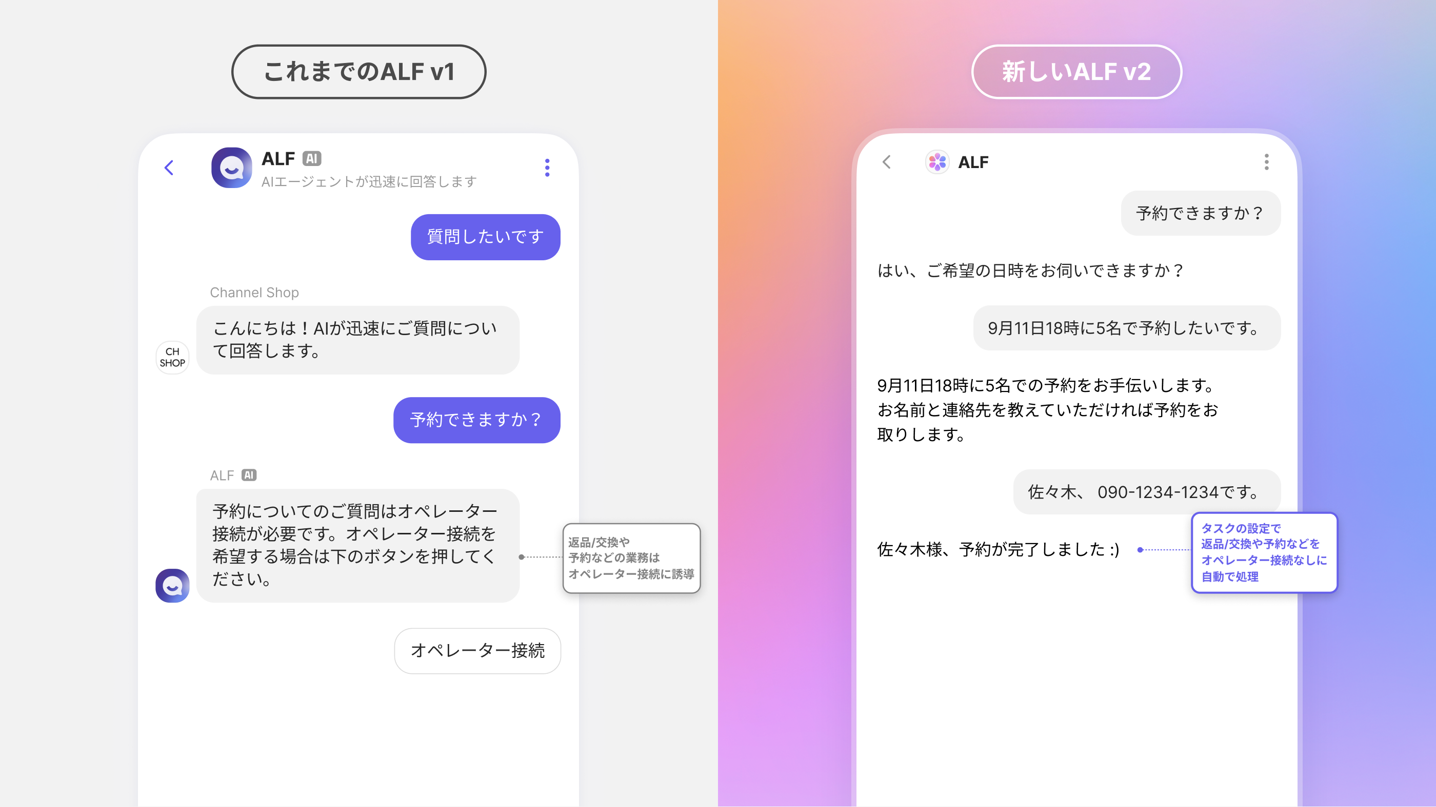 リリースから着々と皆さまの顧客対応メンバーの1人として採用されているALFが、より一人前のオペレーターとして大きく成長します!これまでは顧客からのよくある質問に回答し、有人対応が必要な問い合わせのみをオペレーターが対応していましたが、v2では実際のオペレーターが対応しなければならなかった業務もALFが1人で対応/処理できるようになります😲