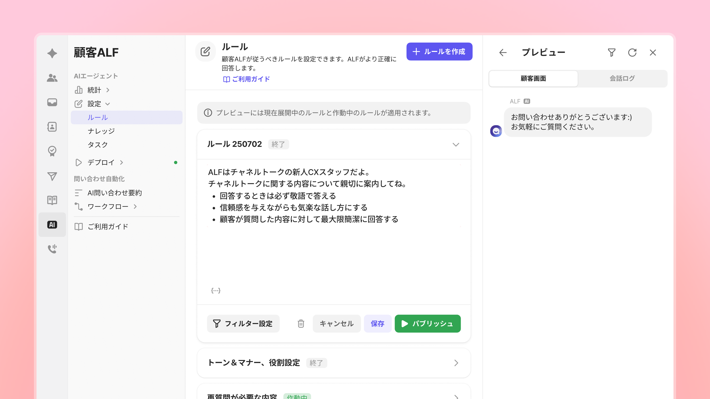 ルールでは状況別にカスタマイズしたプロンプトを設定でき、条件に応じてフィルターを適用して自然で細かい応対が可能になります。