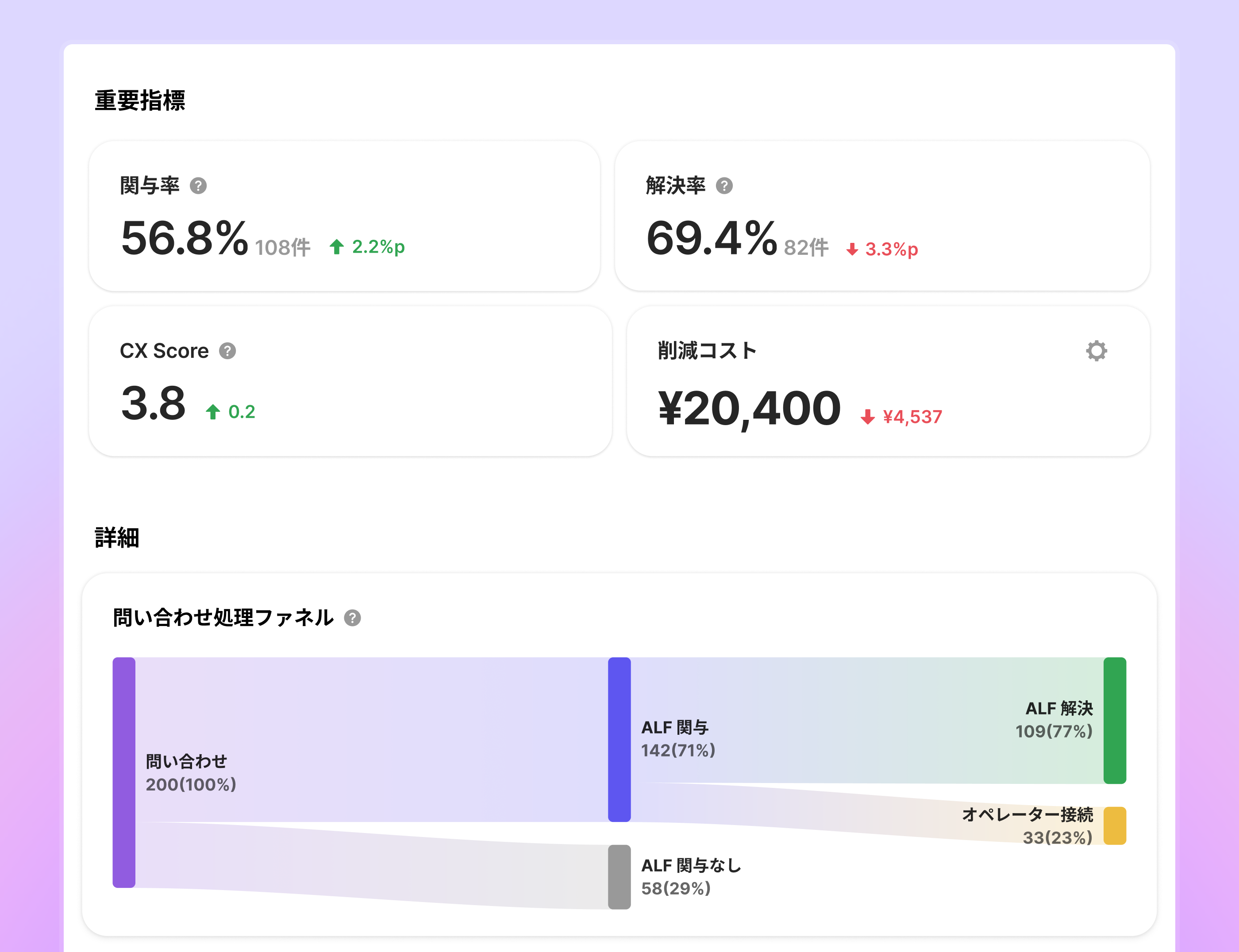 統計機能も新しくなり、ALF v2では、問い合わせの成果を一目で確認できます。ALFの問い合わせへの参加比率、顧客の質問に対する有意義な回答した際の解決率、CX Score、そしてALFを活用することで削減できた費用の概算までを1つの画面で確認することができます。