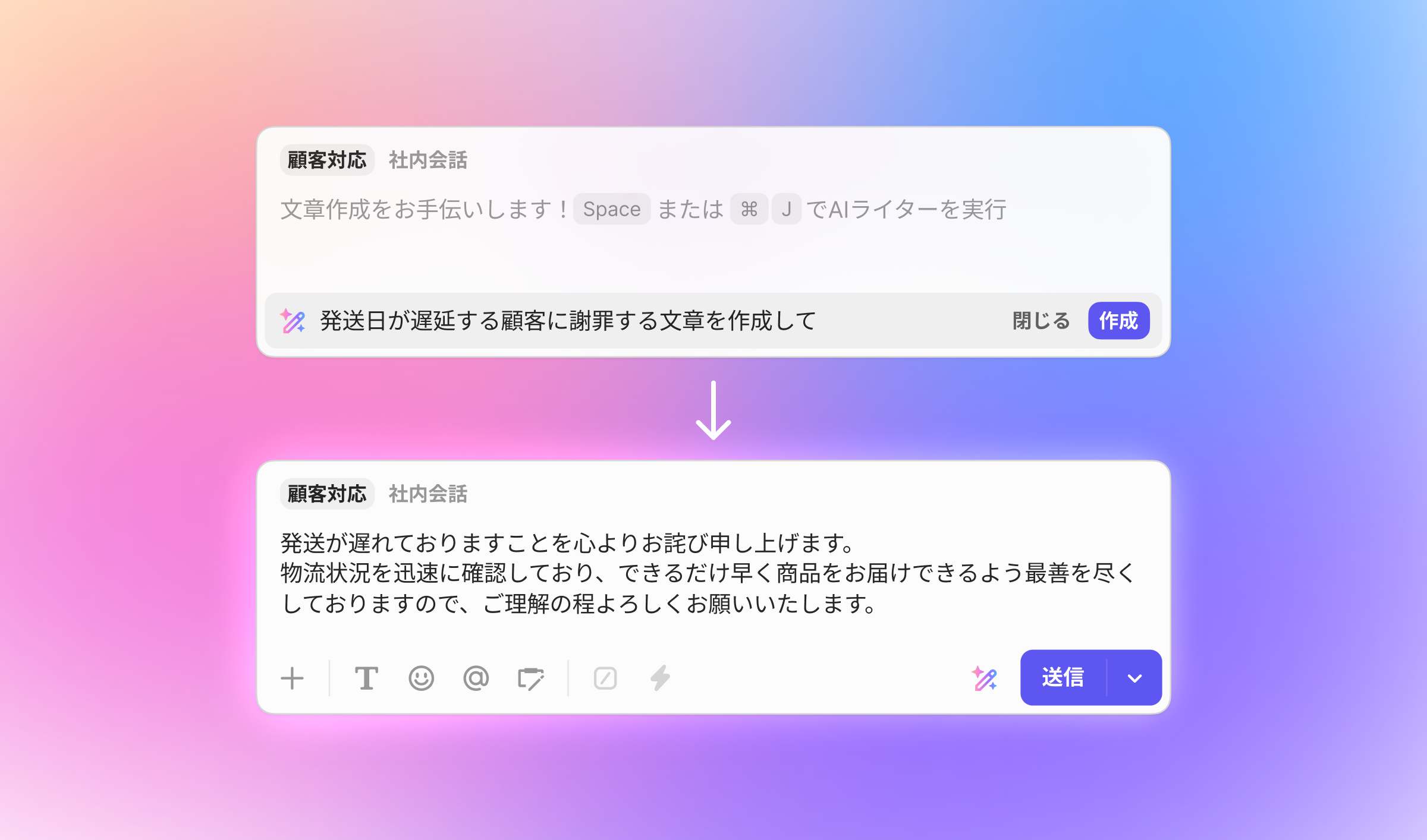 Spaceまたはctrl(⌘)+J例)返品プロセスと所要期間を案内する回答を作って