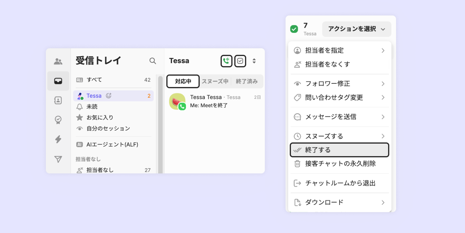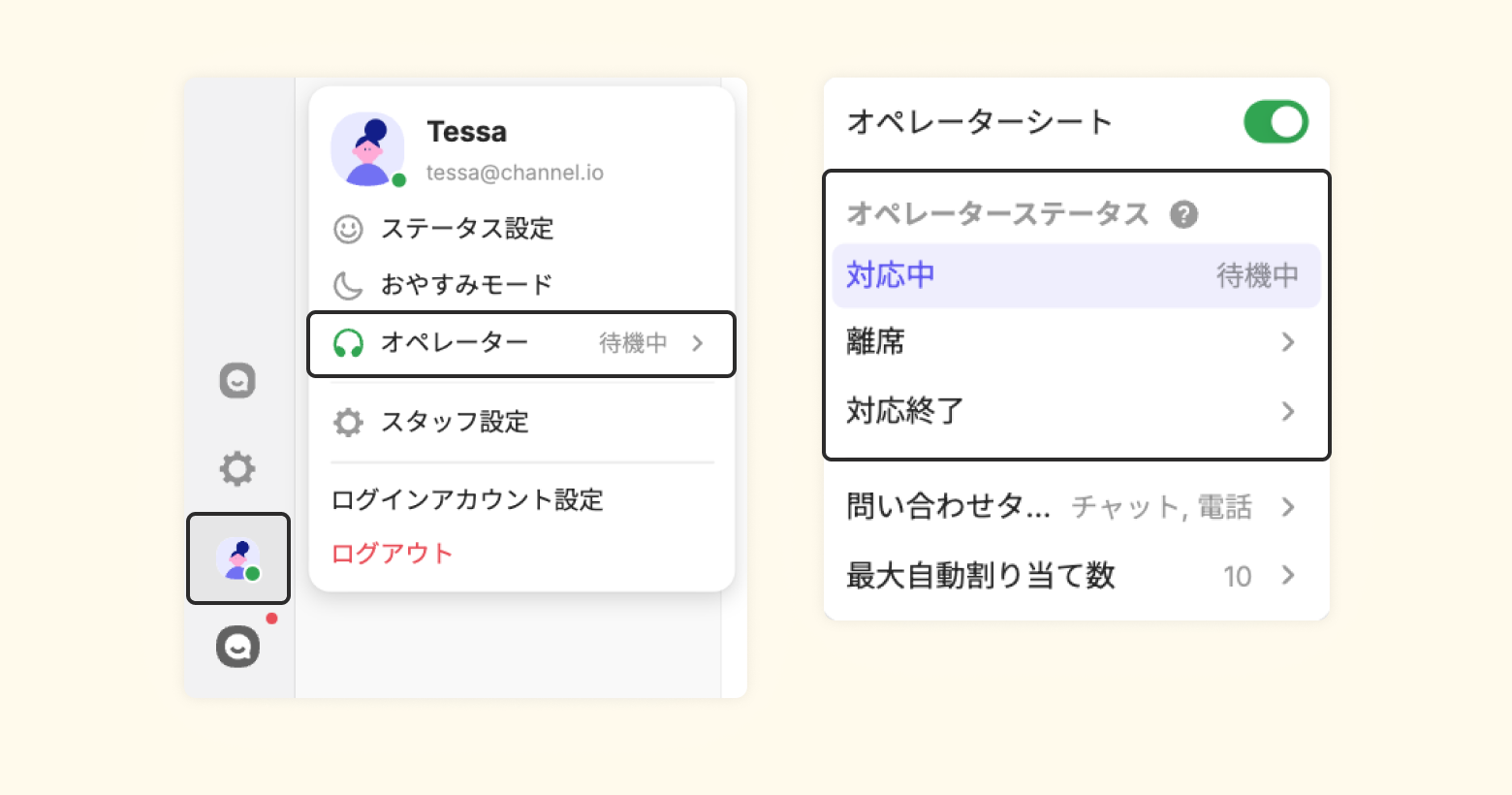 ステータス:オペレーターステータスを対応中/離席/対応終了に設定できます。
