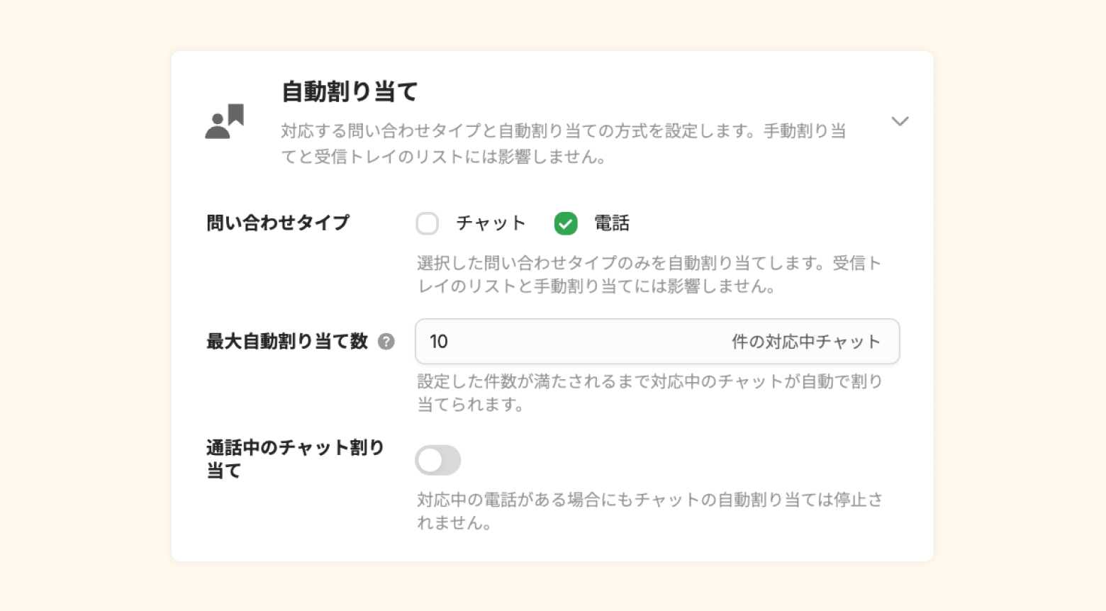 タイプ別の最大自動割り当て数が分離されます。電話の最大自動割り当て数は1つに固定され、チャットはこれまで通り自由に設定できます。