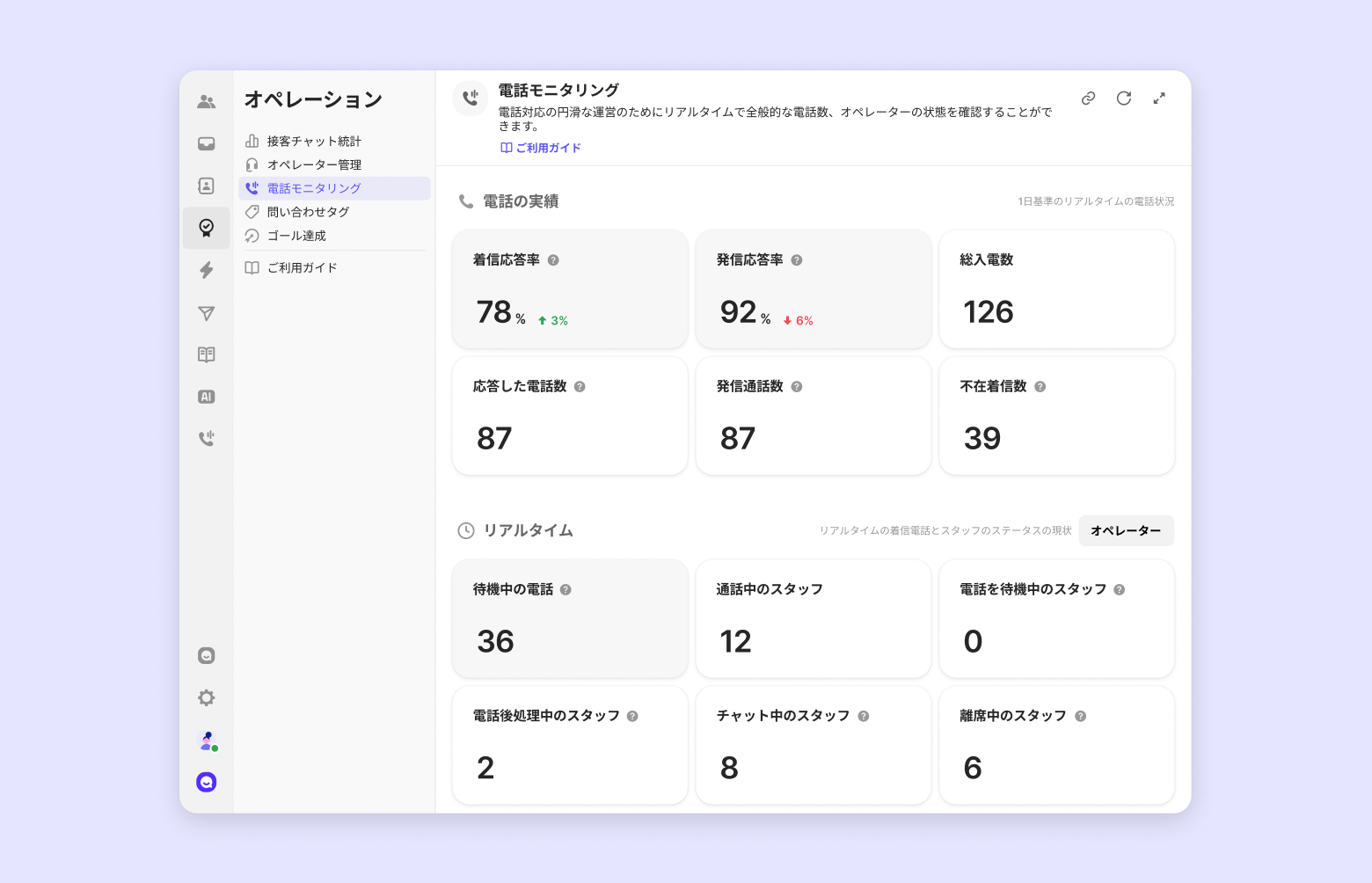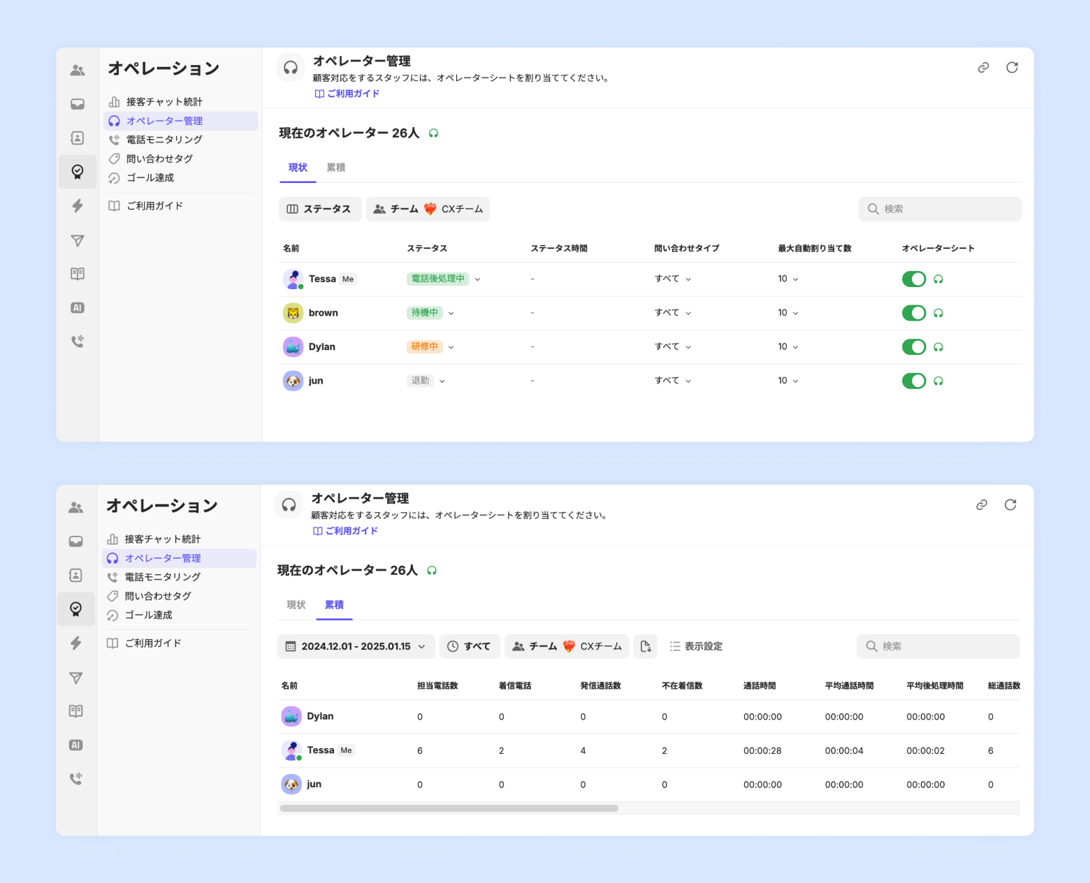 管理者がスタッフのステータスを確認したり、編集して管理できるページです。待機中の電話問い合わせが多い場合は対応中のオペレーターを増やしたり、問い合わせタイプをチャットから電話に変更して効率的なチーム運営をするのをサポートします。