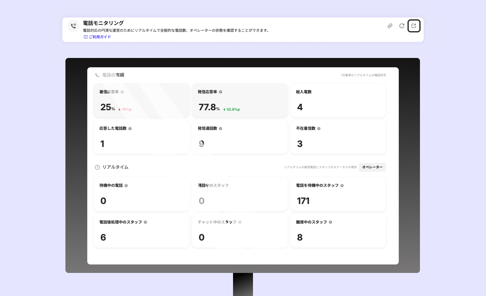 電話モニタリングのダッシュボードを全画面で表示して、現状を目につきやすい形で確認できます。