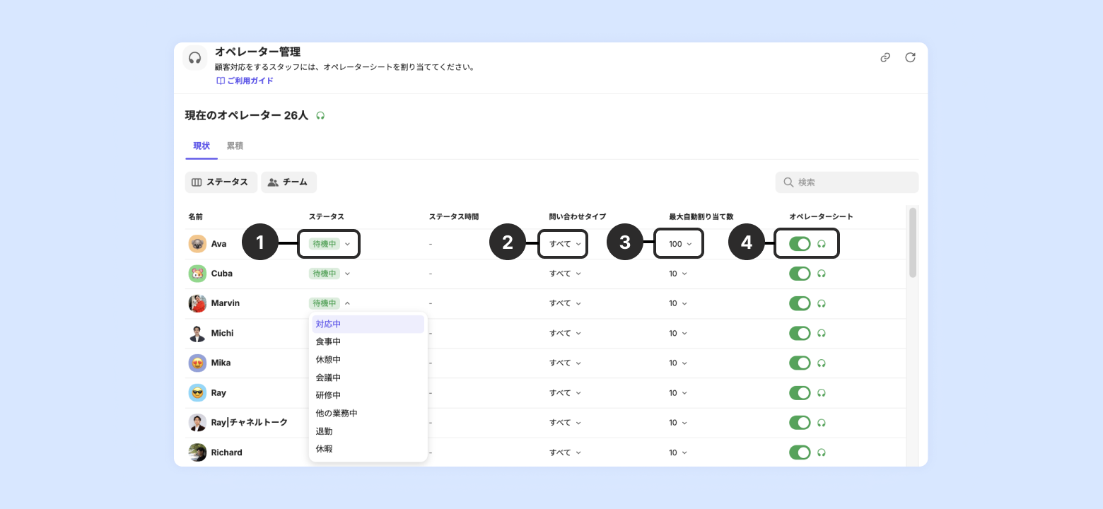 オペレーターは自分自身のステータスを設定でき、管理者はオペレーターの現状を把握できます。