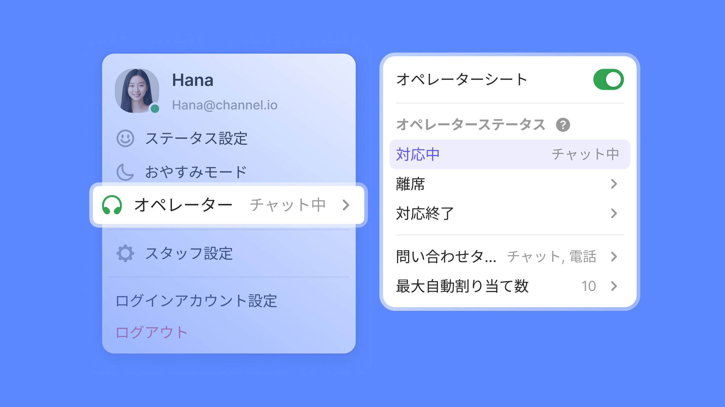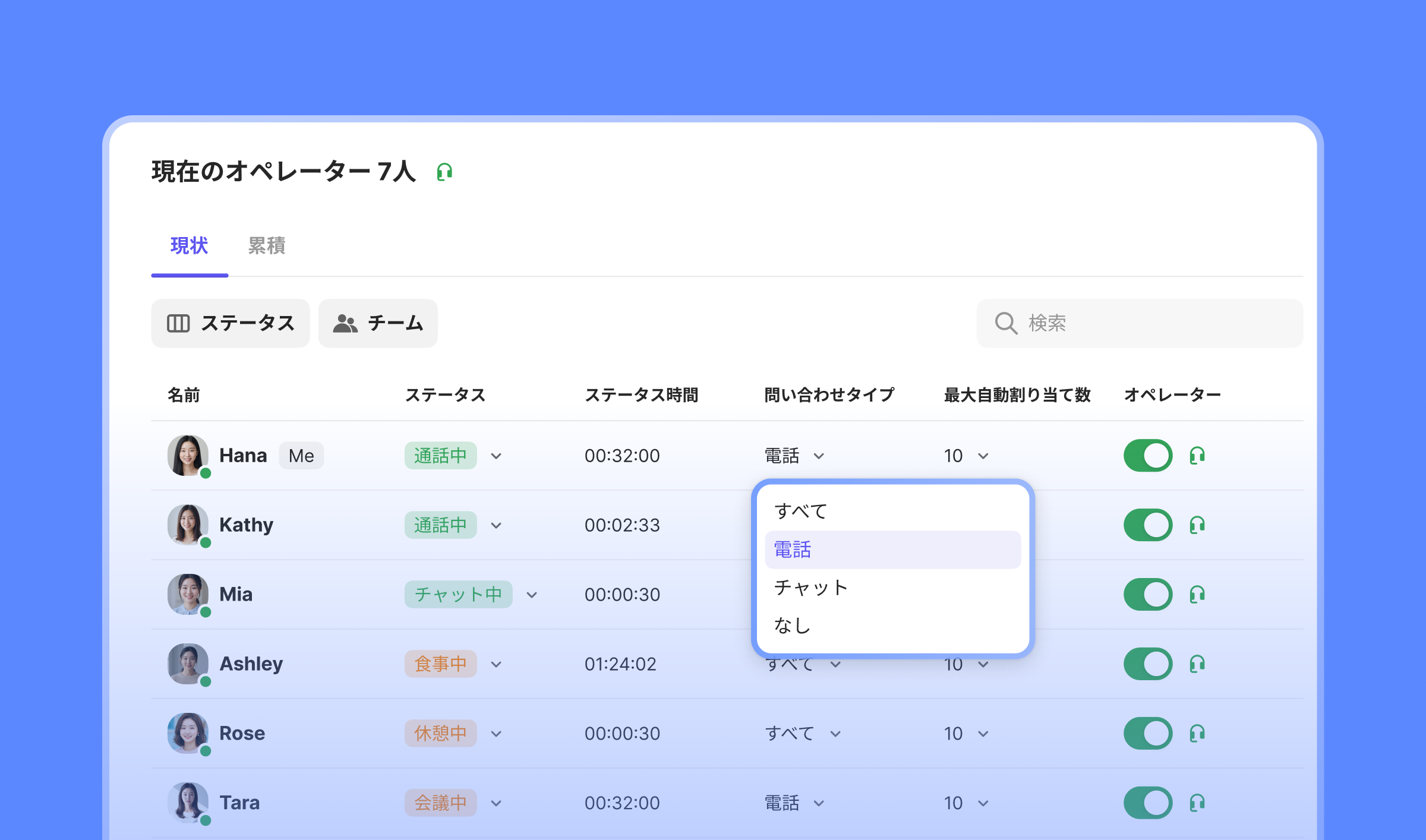 オペレーション機能の権限を保有するスタッフであれば、自分本人だけでなく他のスタッフのステータス・問い合わせタイプ・自動割り当て数を設定できます。有休のスタッフのステータスを変更したり、キューに待機している問い合わせが多い場合は自動割り当て数を調整して対応中の問い合わせを増やすことができます。チームをより効率的に運用してみてください💪