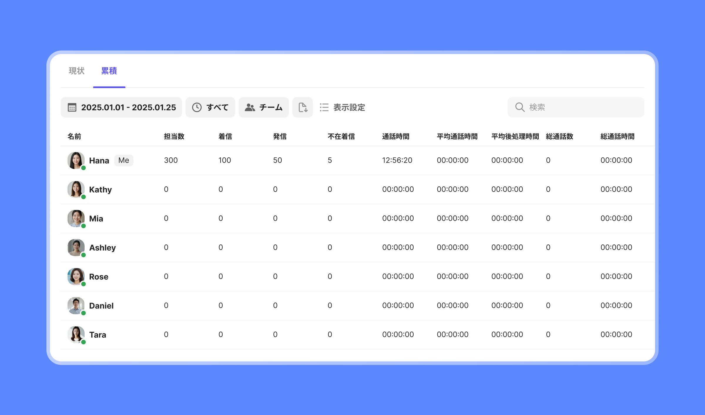 累積ダッシュボードで、オペレーターステータスの累積データを確認できます。スタッフは自分の業務を簡単に共有でき、管理者はステータス別の累積時間を分析してスタッフの業務パターンを把握することができます。また、スタッフごとの通話時間や後処理時間を比較し、改善点や教育が必要な部分を確認できるため、成果分析のデータとしても活用できます。
