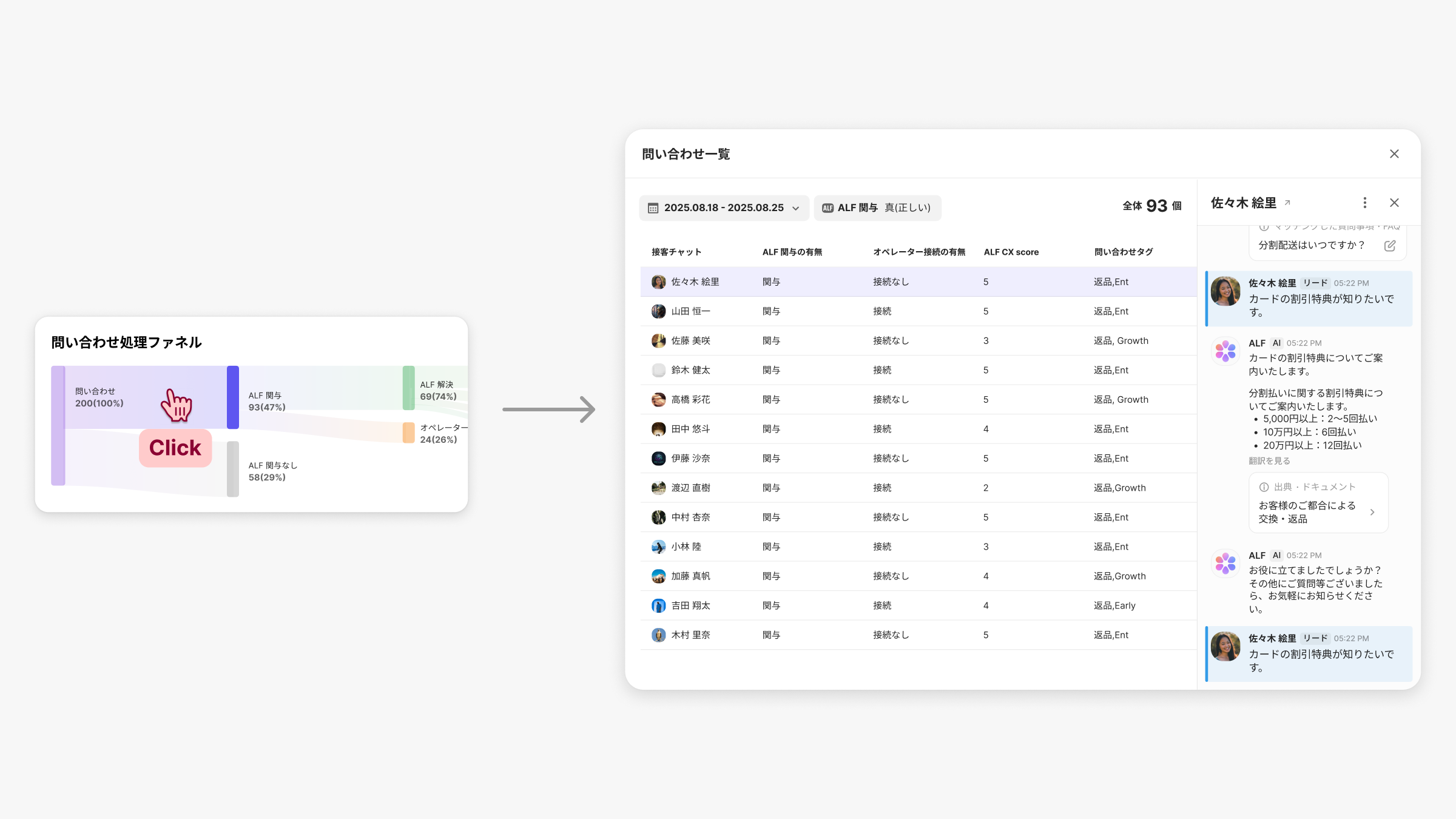 問い合わせ処理ファネルをクリックするだけで、各ファネルごとの問い合わせ一覧をすぐに確認できますさらに、最も参照されたナレッジや最も実行されたタスクも一目で把握できるようになり、ALFがどのように活用されているかをより具体的に可視化できます