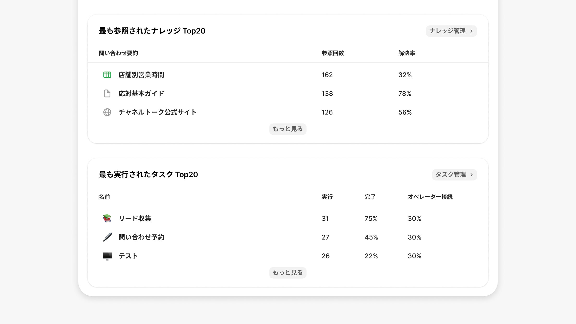 最も参照されているナレッジTOP20、最も実行されたタスクTOP20を確認できます。