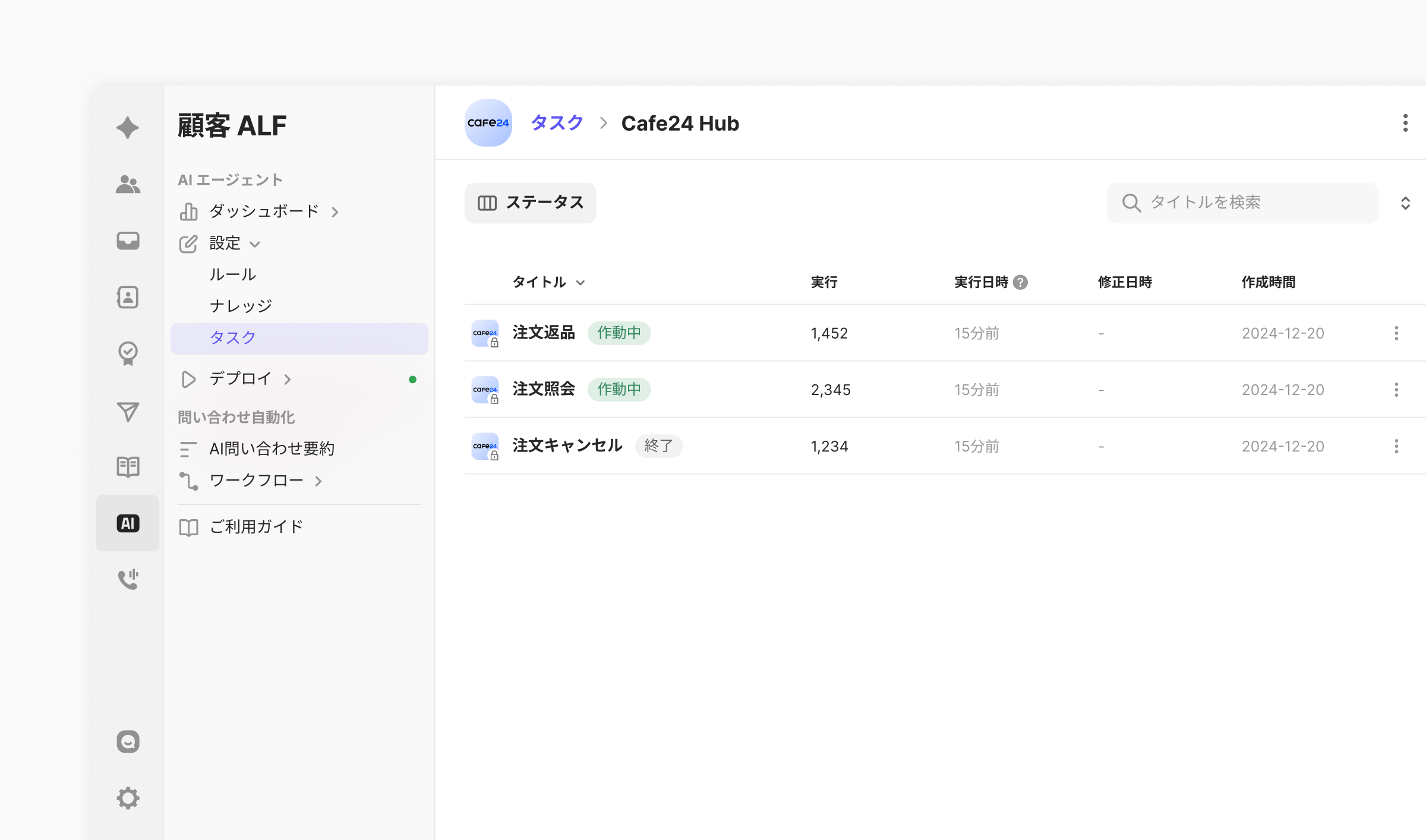 [AIメニュー > タスク > Cafe24Hubフォルダ] から [注文照会] [注文キャンセル] [注文返品] タスクを選択し、右側の 「…」ボタン > [公開] をクリックすると適用されます。